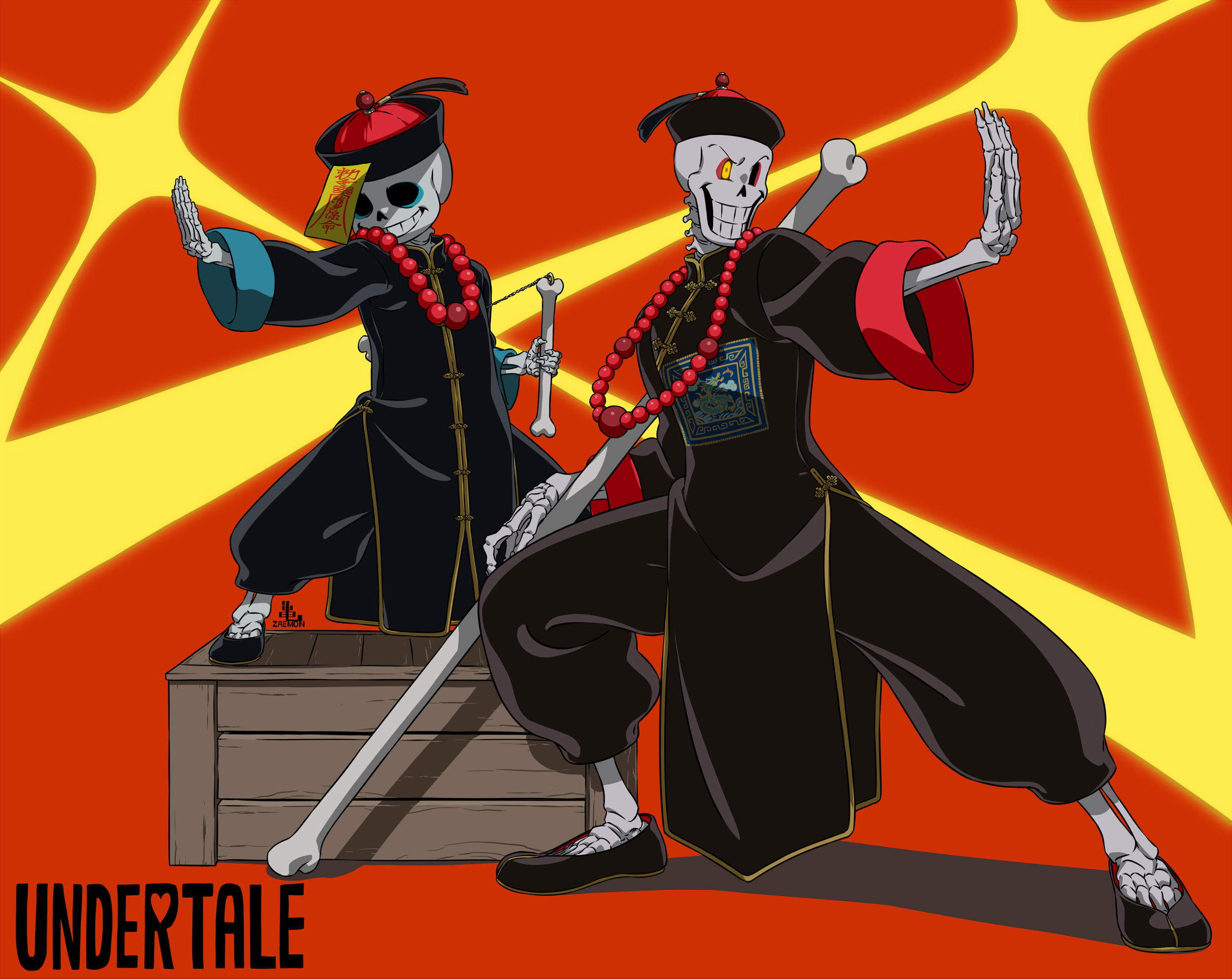 2boys alternate_costume aqua_eyeshadow bead_necklace beads black_dress black_footwear black_headwear black_pants bone brothers cel_shading china_dress chinese_clothes collared_dress commentary copyright_name crate dress eyeshadow from_side full_body grin hat height_difference highres holding holding_bone hollow_eyes jewelry jiangshi_costume kamezaemon legs_apart long_sleeves makeup male_focus multiple_boys necklace ofuda ofuda_on_head outstretched_arm pants papyrus_(undertale) pelvic_curtain qingdai_guanmao red_background red_eyeshadow sans_(undertale) shoes siblings simple_background skeleton smile standing undertale utdr_(toby_fox) yellow_eyes
