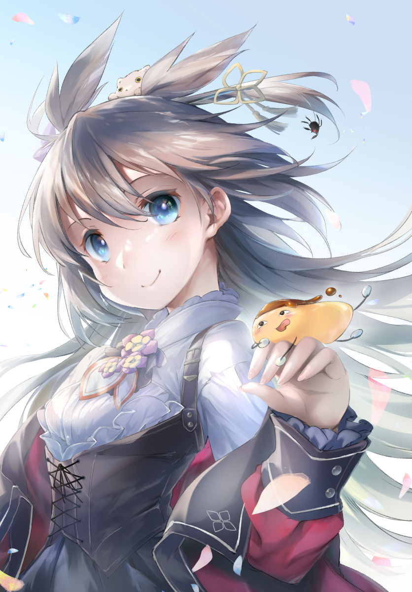 1girl animal animal_on_hand animal_on_head ascot blue_eyes blush bow breasts brown_hair bug corset cross-laced_clothes cross-laced_corset flower frilled_shirt frills hair_bow hand_up head_tilt highres hirasaka_mei_(vtuber) long_hair looking_to_the_side official_art on_head petals shirt sky small_breasts smile solo spider transpot_nonoko underbust virtual_youtuber wind