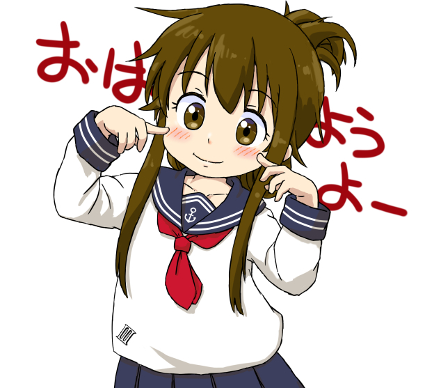 1girl anchor_symbol blue_sailor_collar blue_skirt brown_eyes brown_hair folded_ponytail inazuma_(kancolle) kantai_collection long_hair long_sleeves neckerchief pleated_skirt red_neckerchief sailor_collar school_uniform serafuku shirt sidelocks skirt smile solo text_background upper_body white_background white_shirt zatsu_(zasshu_neko)