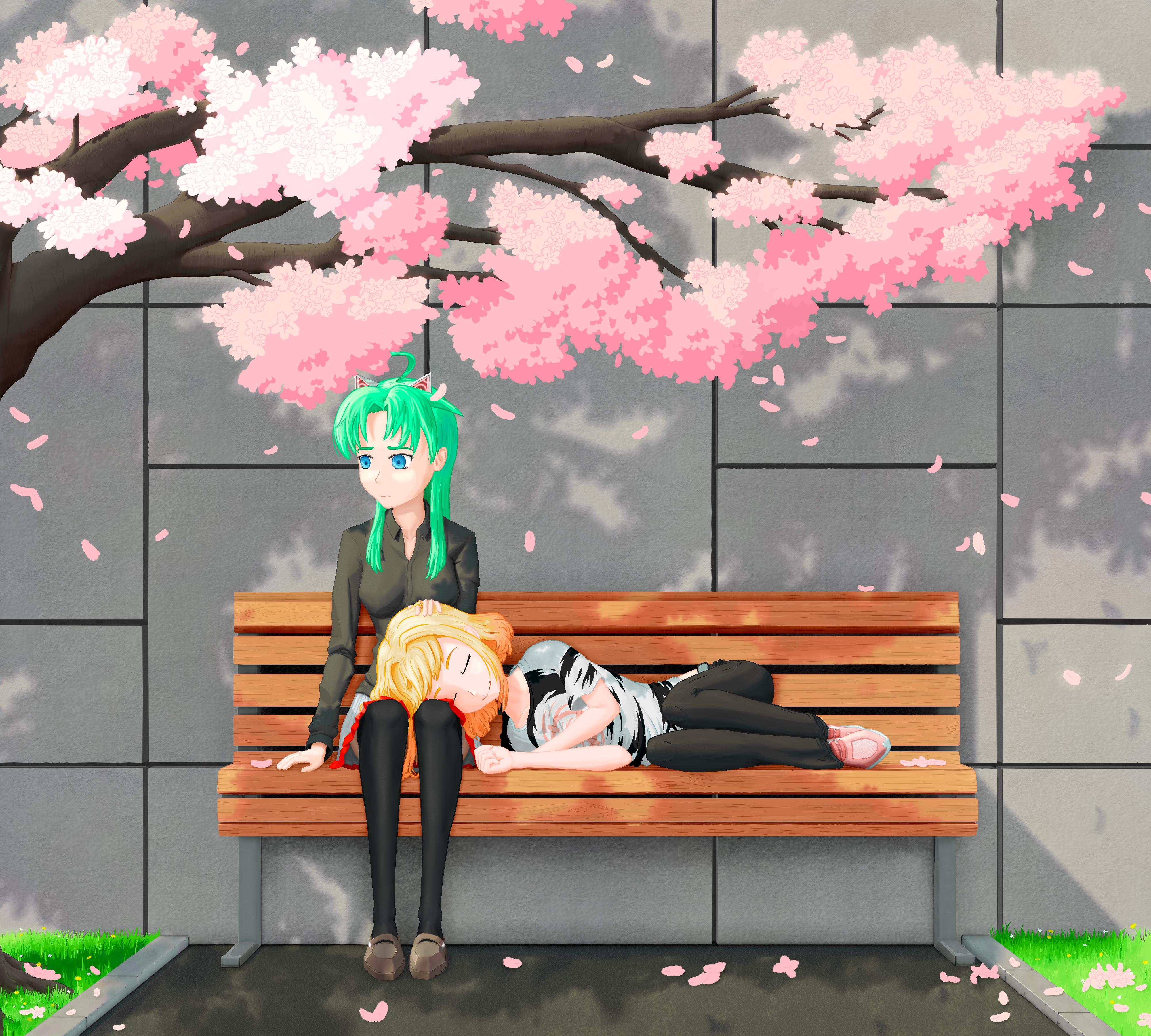 2girls absurdres bench blonde_hair blue_eyes cherry_blossoms denim green_hair highres jeans long_hair looking_to_the_side medium_hair multiple_girls nyanskii original pants self-upload shirt shoes skirt smile sneakers white_shirt