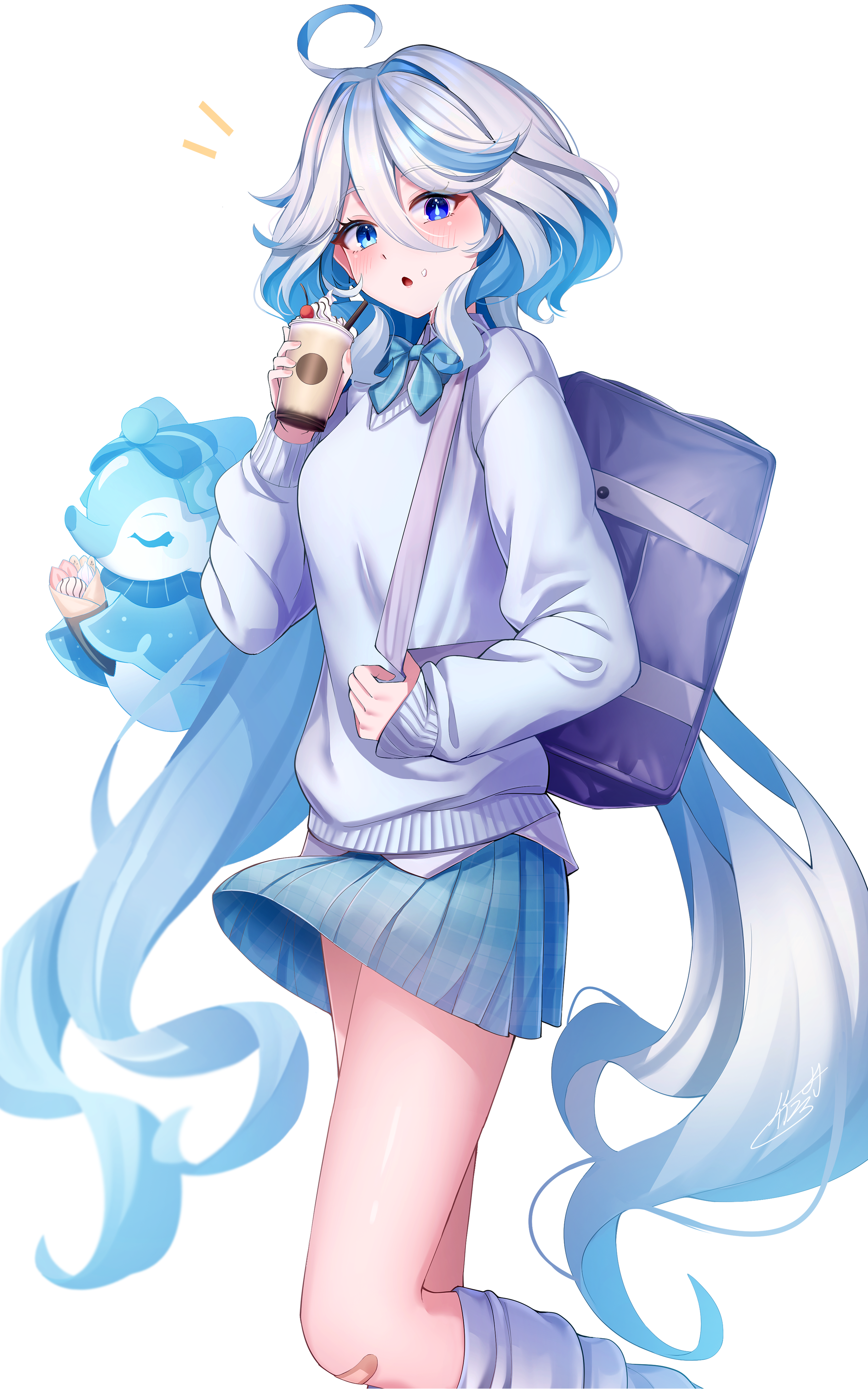 1girl absurdres ahoge bag bandaid bandaid_on_knee bandaid_on_leg blue_eyes blue_skirt blush commentary_request cowboy_shot crepe drinking_straw food food_on_face furina_(genshin_impact) genshin_impact highres holding knee_up long_hair long_sleeves looking_at_viewer loose_socks mismatched_pupils multicolored_hair school_bag school_uniform simple_background skirt socks solo streaked_hair surintendante_chevalmarin takemura_kou twintails white_background white_hair white_socks