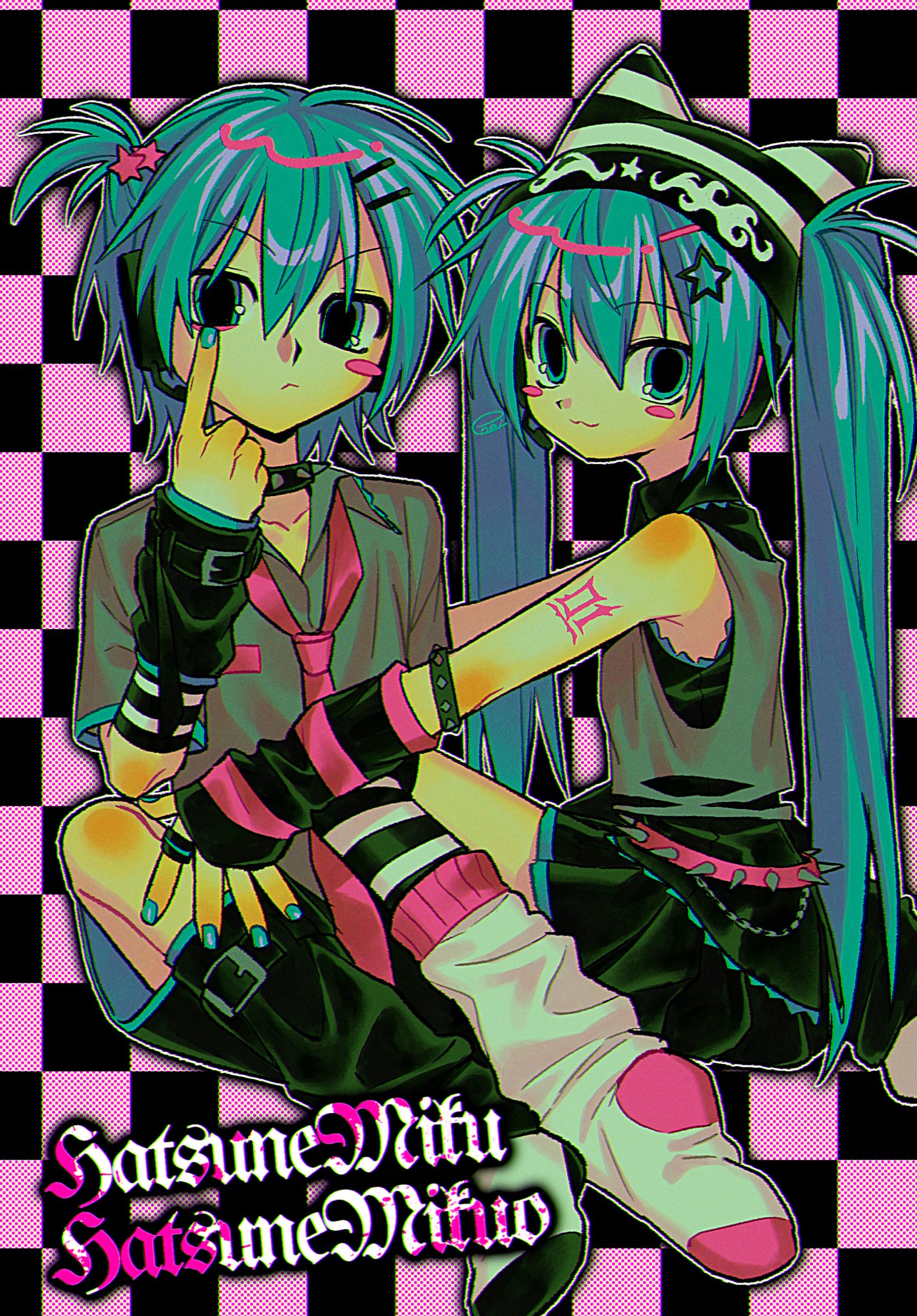 1boy 1girl :3 adapted_costume animal_hat aqua_eyes aqua_hair aqua_nails arm_warmers bare_shoulders beanie black_arm_warmers black_leg_warmers black_shorts black_skirt blackletter blush_stickers character_name checkered_background closed_mouth collar eyelid_pull genderswap genderswap_(ftm) grey_shirt hair_between_eyes hair_ornament hat hatsune_miku hatsune_mikuo highres jewelry leg_warmers long_hair looking_at_viewer loose_necktie loose_socks menma_(enaic31) miniskirt nail_polish necktie pink_necktie ring shirt short_hair short_sleeves short_twintails shorts signature sitting skirt sleeveless sleeveless_shirt socks socks_over_thighhighs spiked_belt spiked_collar spikes star_(symbol) star_hair_ornament striped_clothes striped_headwear striped_thighhighs thighhighs twintails vocaloid white_socks y2k_fashion