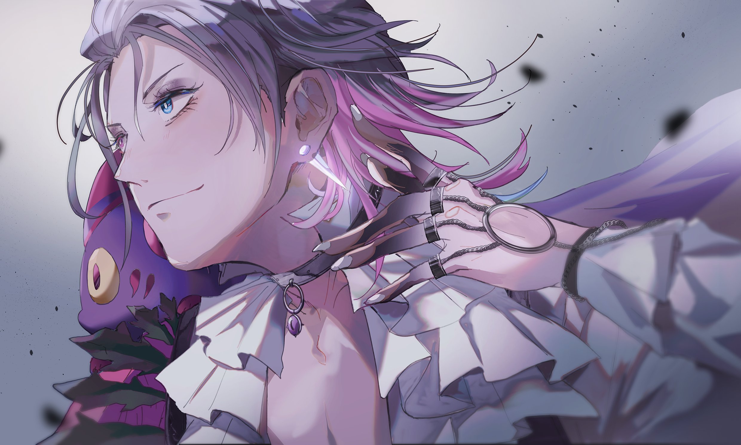 bishounen black_choker black_eyeshadow blue_eyes blue_hair choker claws commentary creature creature_on_shoulder earrings english_commentary eyelashes eyeshadow frilled_shirt frills from_side gavis_bettel gavis_bettel_(2nd_costume) gradient_skin grey_hair hand_up heterochromia highres holostars holostars_english jewelry light_smile looking_ahead makeup male_focus multicolored_hair multiple_rings official_alternate_costume official_alternate_hairstyle on_shoulder phantom_(gavis_bettel) pink_eyes pink_hair ring riz_tempura shirt short_hair virtual_youtuber white_shirt