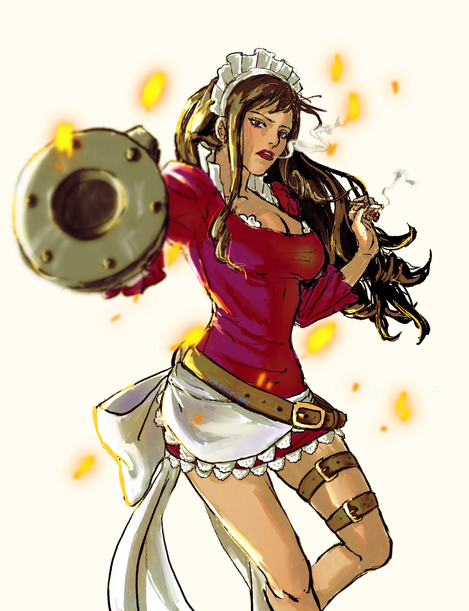 1girl apron baby_5 belt cigarette cowboy_shot highres holding holding_cigarette long_hair maid_apron maid_headdress nirelle_art one_piece sidelocks simple_background smoke solo weapon white_background
