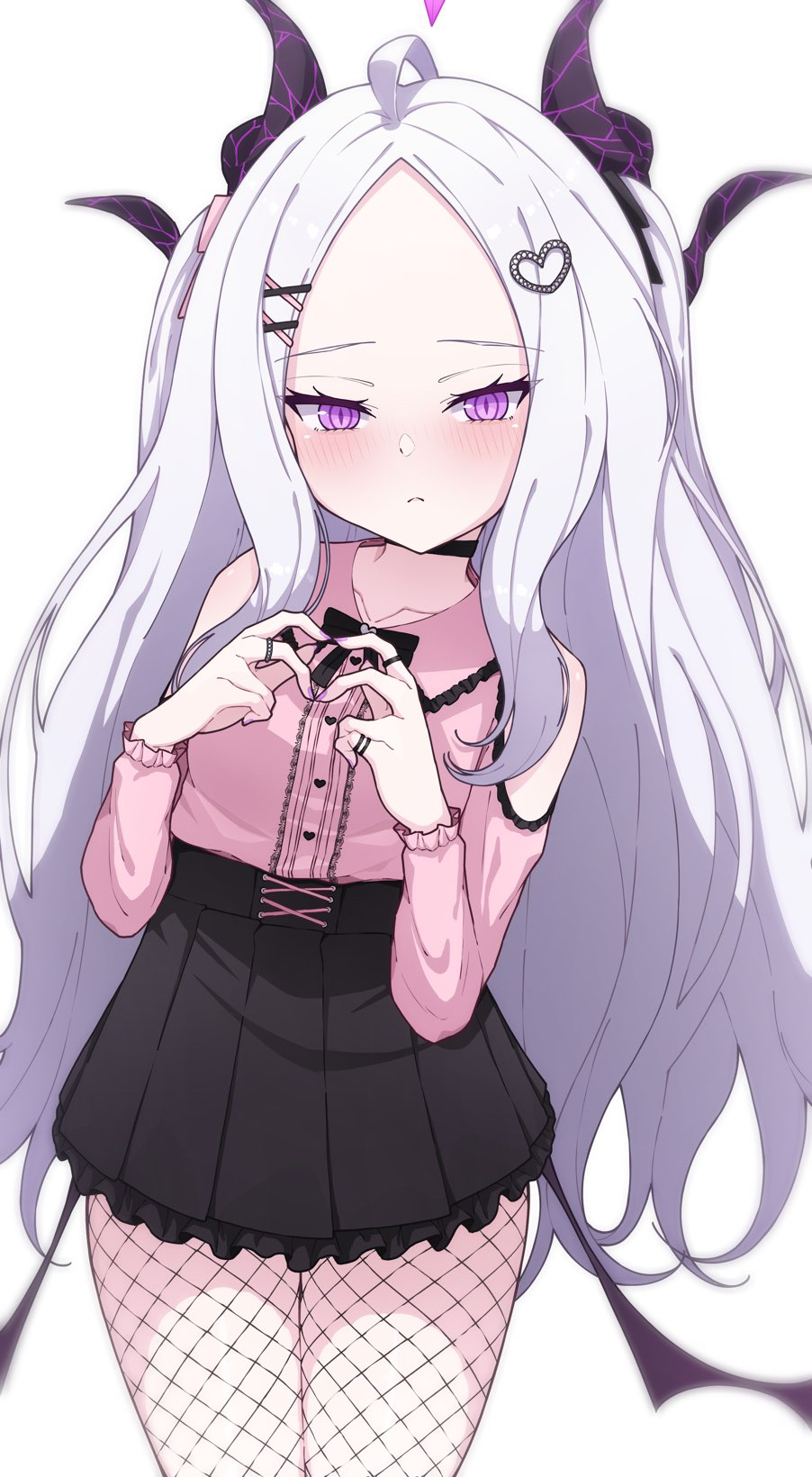 1girl ahoge alternate_costume arm_cutout black_bow black_bowtie black_skirt blue_archive blush bow bowtie center_frills clothing_cutout collared_shirt commentary_request cowboy_shot demon_horns eyelashes fishnet_pantyhose fishnets frilled_shirt frilled_skirt frills frown grey_hair hair_ornament hairclip hands_up heart heart_hair_ornament heart_hands high-waist_skirt highres hina_(blue_archive) horns jewelry jirai_kei long_hair long_sleeves looking_at_viewer nail_polish nose_blush pantyhose parted_bangs pink_shirt pleated_skirt purple_eyes purple_nails reijing_etrn ring shirt sidelocks skirt slit_pupils solo thighs tsurime two_side_up very_long_hair x_hair_ornament