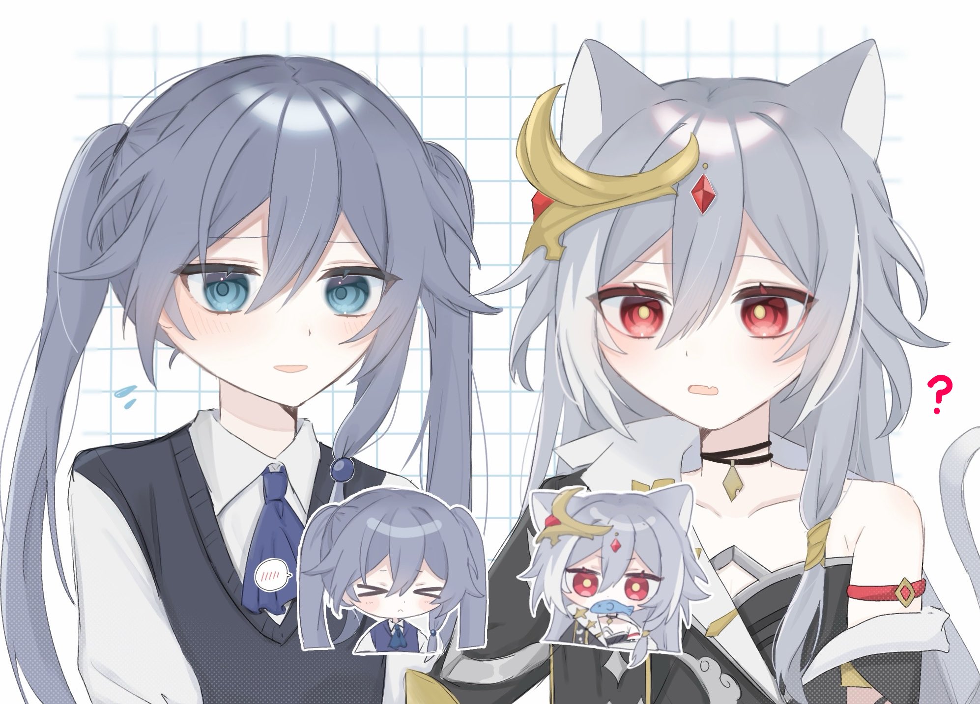 2girls ? alternate_hairstyle animal_ears asymmetrical_clothes asymmetrical_sleeves black_choker black_dress black_hanfu black_shirt blue_eyes blue_hair blue_vest cat_ears cat_tail chibi chibi_inset china_dress chinese_clothes choker closed_eyes closed_mouth collared_shirt dress eyeliner fish_in_mouth fu_hua herrscher_of_sentience grey_hair hair_between_eyes hair_ornament hanfu highres honkai_(series) honkai_impact_3rd jewelry light_smile long_hair long_shirt long_sleeves makeup multicolored_hair multiple_girls official_alternate_costume parted_lips red_eyeliner red_eyes red_rope rope shirt single_bare_shoulder single_off_shoulder streaked_hair tail twintails uneven_sleeves vest white_background white_hair white_shirt xtx_mercury yellow_pupils