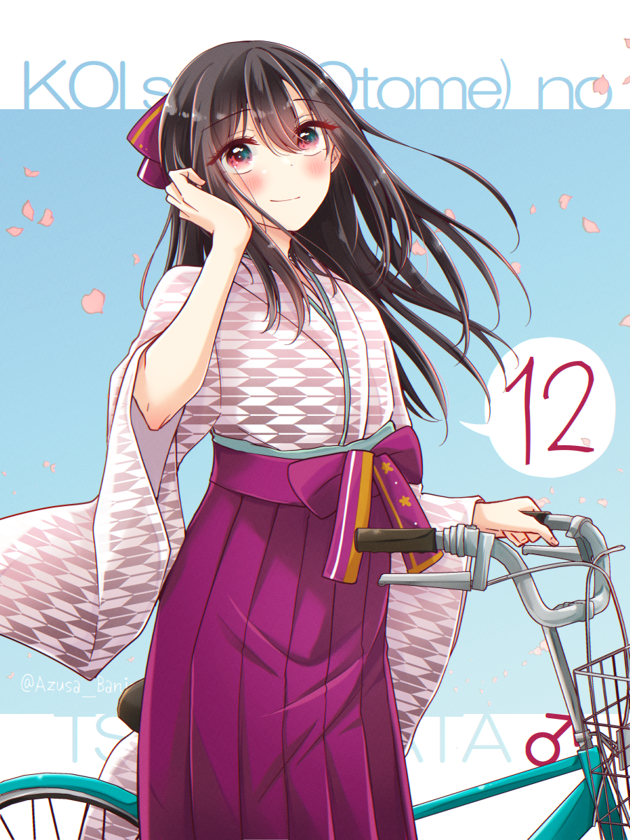 1boy banjou_azusa bicycle bicycle_basket black_hair blush bow closed_mouth crossdressing crossdressing_(mtf) hair_between_eyes hair_bow highres hiura_mihate japanese_clothes kimono koisuru_(otome)_no_tsukurikata long_sleeves male_focus mars_symbol pink_eyes simple_background smile solo trap