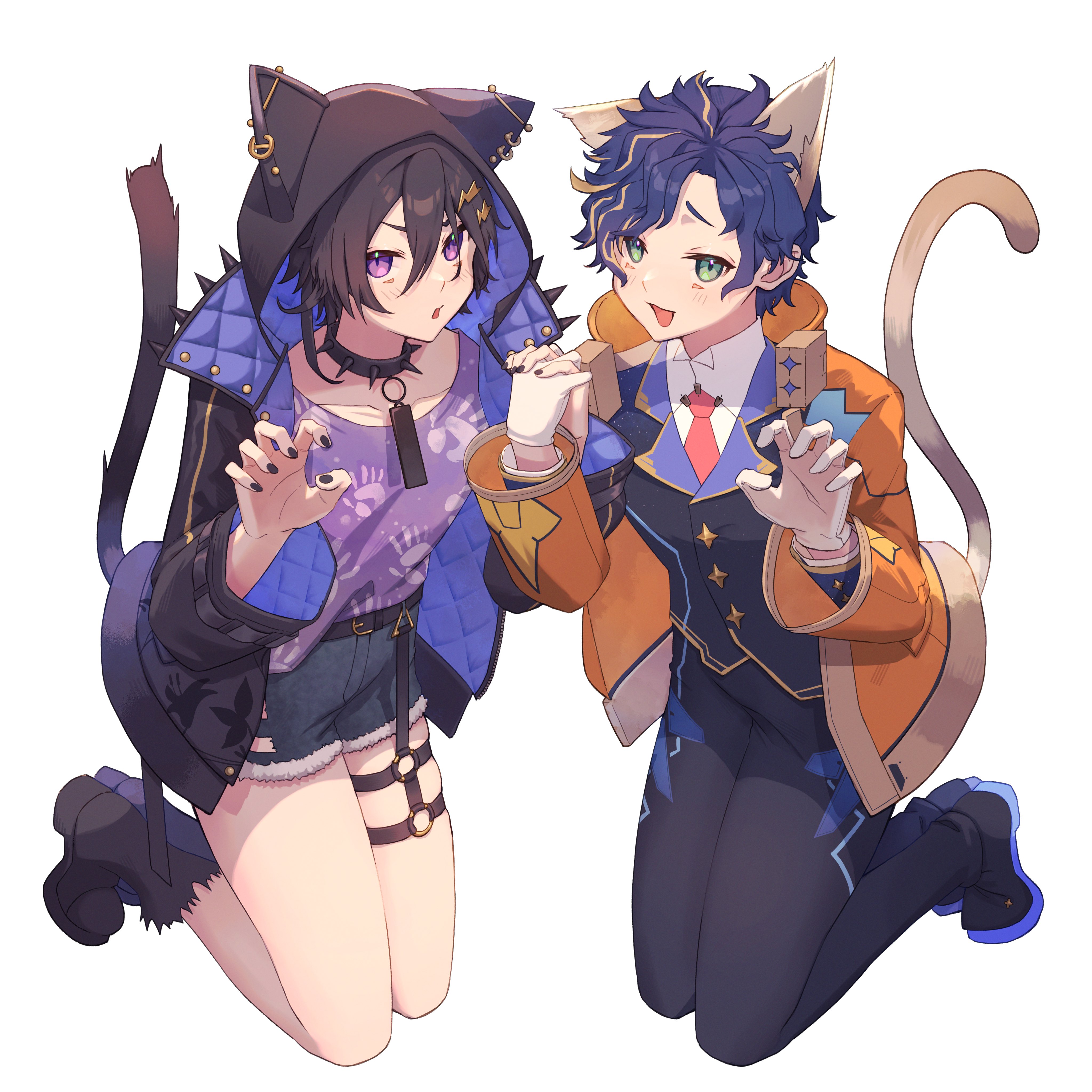 2boys absurdres animal_ears astel_leda black_hair black_nails blonde_hair blue_hair blush cat_boy cat_day cat_ears cat_tail claw_pose collar earrings full_body green_eyes highres holding_hands holostars hood hood_up jacket jewelry kanade_izuru kanade_izuru_(1st_costume) kneeling male_focus multicolored_hair multiple_boys necktie noookaaa open_clothes open_jacket open_mouth purple_eyes red_necktie short_hair shorts spiked_collar spikes tail thigh_strap virtual_youtuber white_background