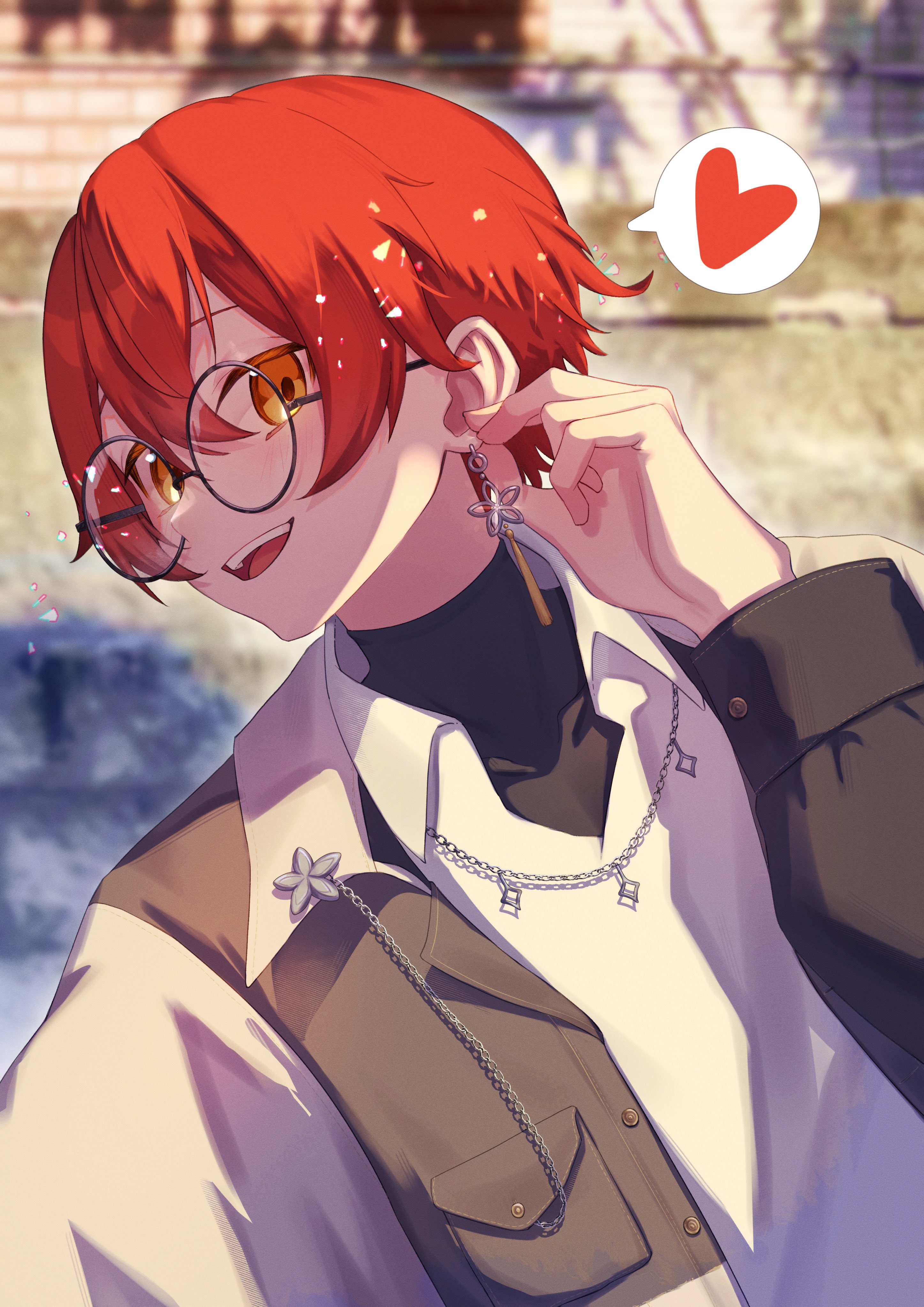 1boy absurdres collared_shirt earrings glasses hanasaki_miyabi hanasaki_miyabi_(7th_costume) heart highres holostars jewelry looking_at_viewer male_focus necklace noookaaa open_mouth outdoors red_hair round_eyewear shirt short_hair sidelighting smile solo speech_bubble spoken_heart teeth upper_body upper_teeth_only virtual_youtuber white_shirt yellow_eyes