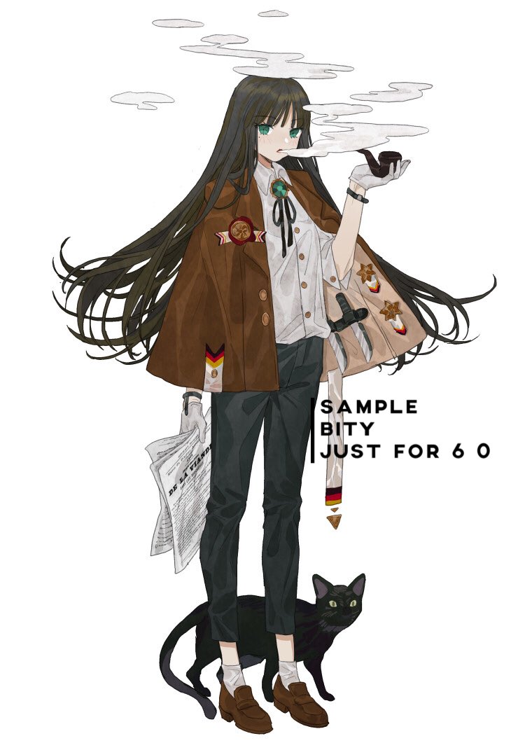 1girl artist_name badge bity3155660241 black_cat black_pants black_ribbon blunt_bangs brooch brown_hair brown_jacket brown_shoes buttons cat collared_shirt commentary_request denim eyelashes full_body gem gloves green_eyes green_gem holding holding_newspaper holding_smoking_pipe jacket jacket_on_shoulders jeans jewelry long_hair long_sleeves neck_ribbon newspaper open_mouth original pants ribbon sample_watermark shirt shoes simple_background smoke smoking smoking_pipe socks solo straight_hair three-quarter_sleeves uwabaki watch watermark white_background white_gloves white_shirt white_sleeves white_socks wristwatch