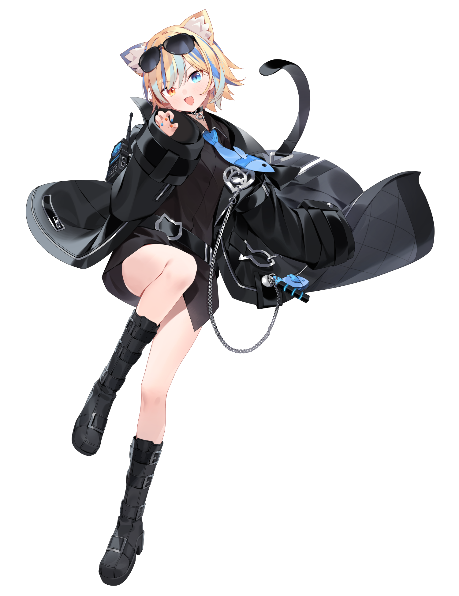 animal_ears black_boots black_coat black_survival blonde_hair blue_eyes blue_hair blue_necktie boots cat_ears choker coat eternal_return:_black_survival eyewear_on_head fang heterochromia highres irem_(black_survival) multicolored_hair multicolored_nails necktie official_alternate_costume official_art orange_eyes sankyaku_tako sunglasses two-tone_hair