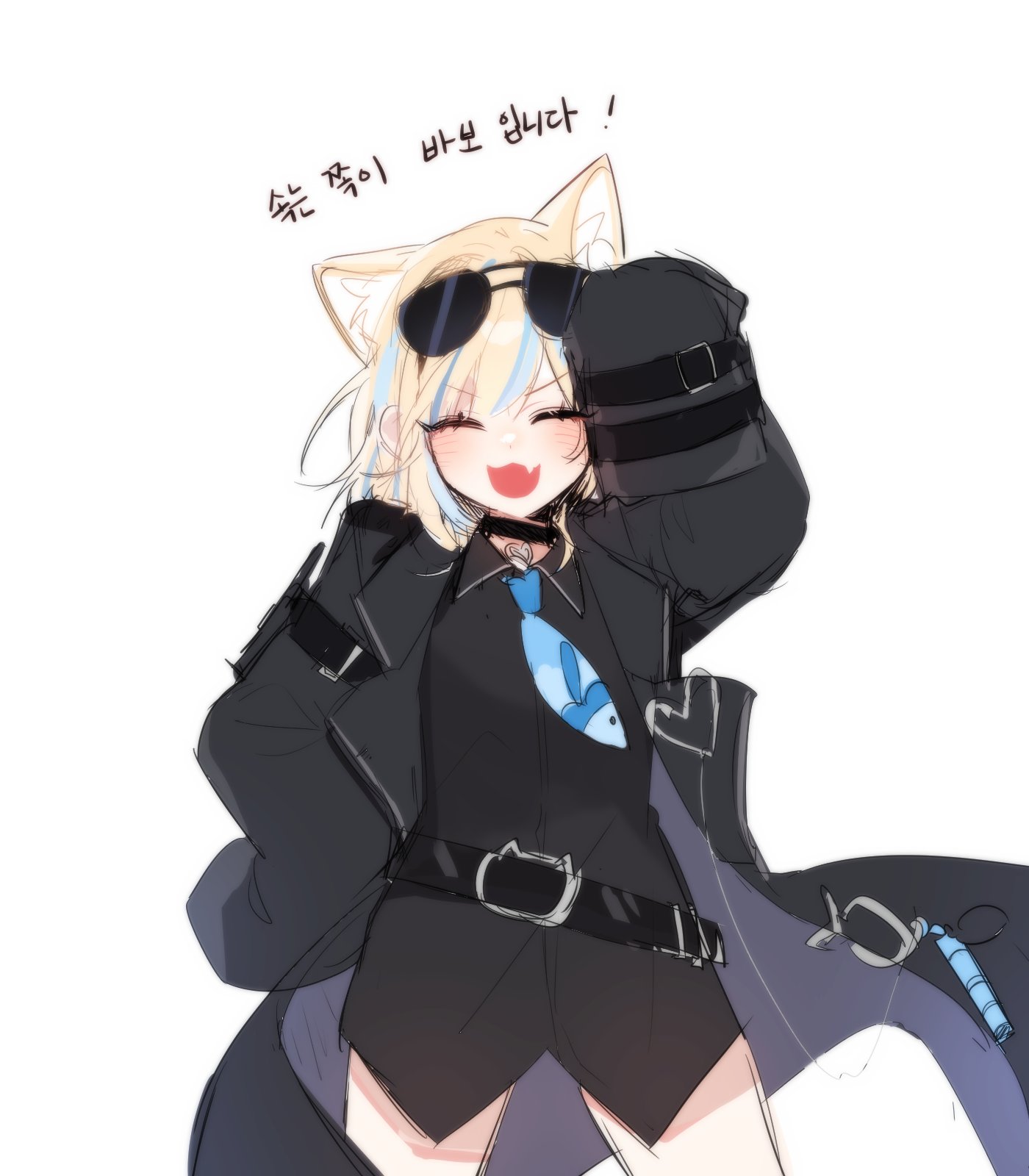 1girl animal_ears black_coat black_survival blonde_hair blue_hair blue_necktie cat_ears choker coat eternal_return:_black_survival eyewear_on_head fang highres irem_(black_survival) korean_text multicolored_hair necktie official_alternate_costume open_mouth sj00 translated two-tone_hair