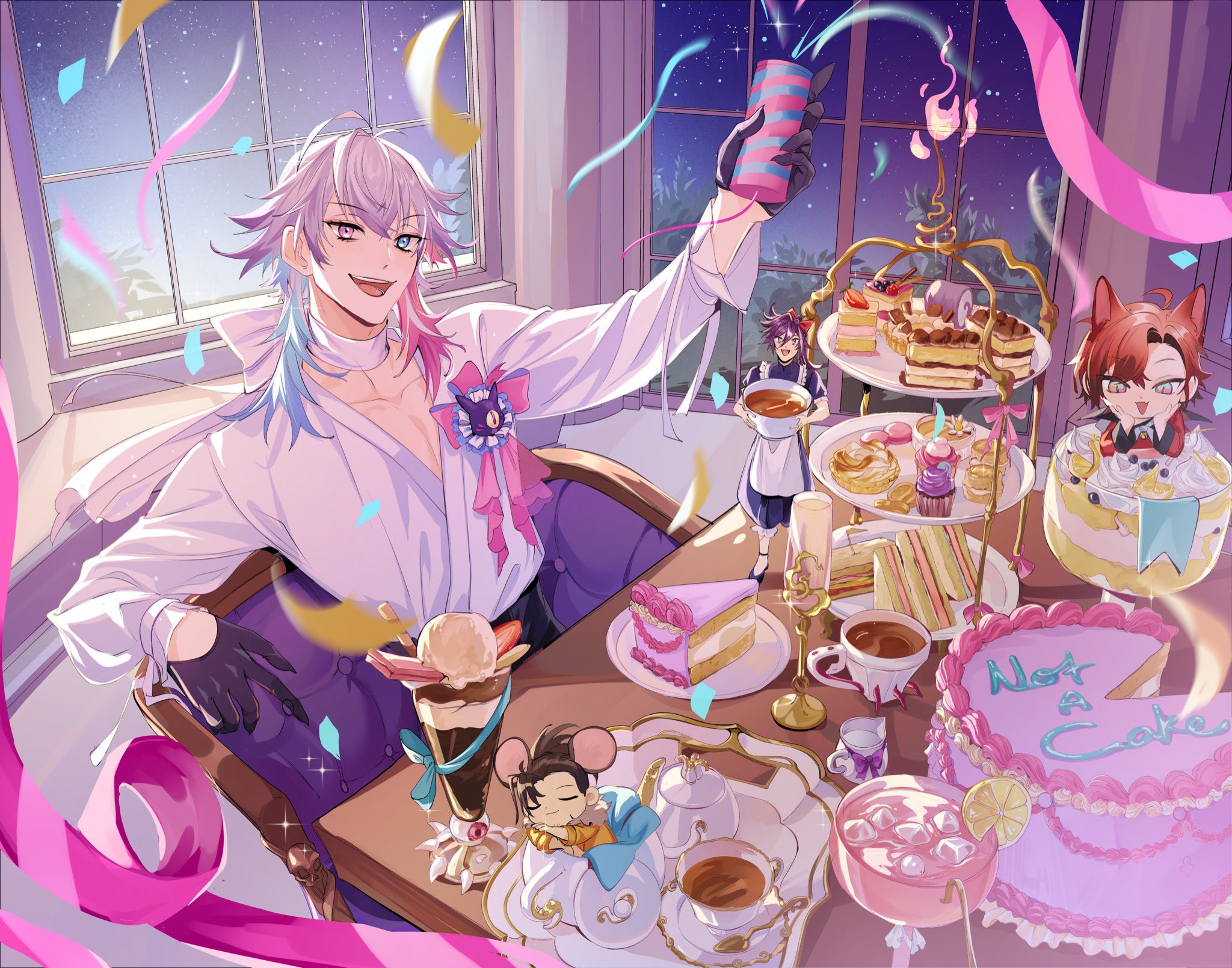 4boys ahoge animal_ears banzoin_hakka bishounen black_gloves black_hair blue_eyes blue_hair cake cake_slice cat_ears confetti cup danasauurr eyeshadow food gavis_bettel gloves grey_hair hair_between_eyes heterochromia highres holding holding_party_popper holostars holostars_english holotempus ice_cream josuiji_shinri long_hair looking_at_viewer machina_x_flayon makeup male_focus mouse_boy mouse_ears multicolored_hair multiple_boys night open_mouth party_popper phantom_(gavis_bettel) pink_eyes pink_eyeshadow pink_hair pink_ribbon purple_hair red_hair ribbon sandwich scarf shirt short_hair sitting sky sleeping sparkle star_(sky) starry_sky sundae sweets table teacup teapot tiramisu virtual_youtuber white_scarf white_shirt window