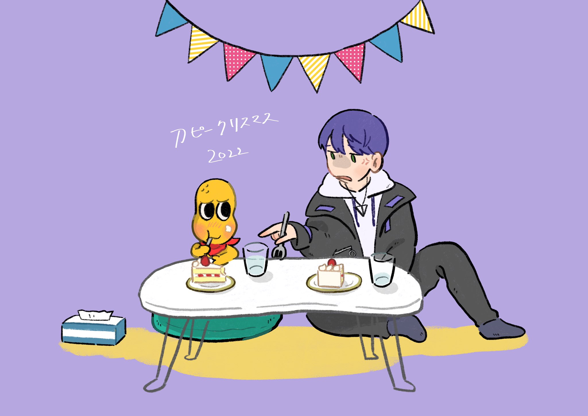 2boys anger_vein bald bandana bandana_around_neck black_jacket black_pants blush cake cake_slice colored_skin commentary_request cup cushion drinking_glass eating food food_on_face fork frown full_body green_eyes highres holding holding_fork hood hood_down hoodie icing jacket jacket_over_hoodie kenmochi_touya kenmochi_touya_(8th_costume) knee_up long_sleeves looking_at_another male_focus mode_aim momoco_(momco04) multiple_boys nijisanji on_floor open_clothes open_jacket open_mouth pants peanuts-kun pennant pointing pointing_at_another purple_background purple_hair purple_socks short_hair sitting socks string_of_flags table tissue_box translation_request virtual_youtuber water white_hoodie yellow_skin