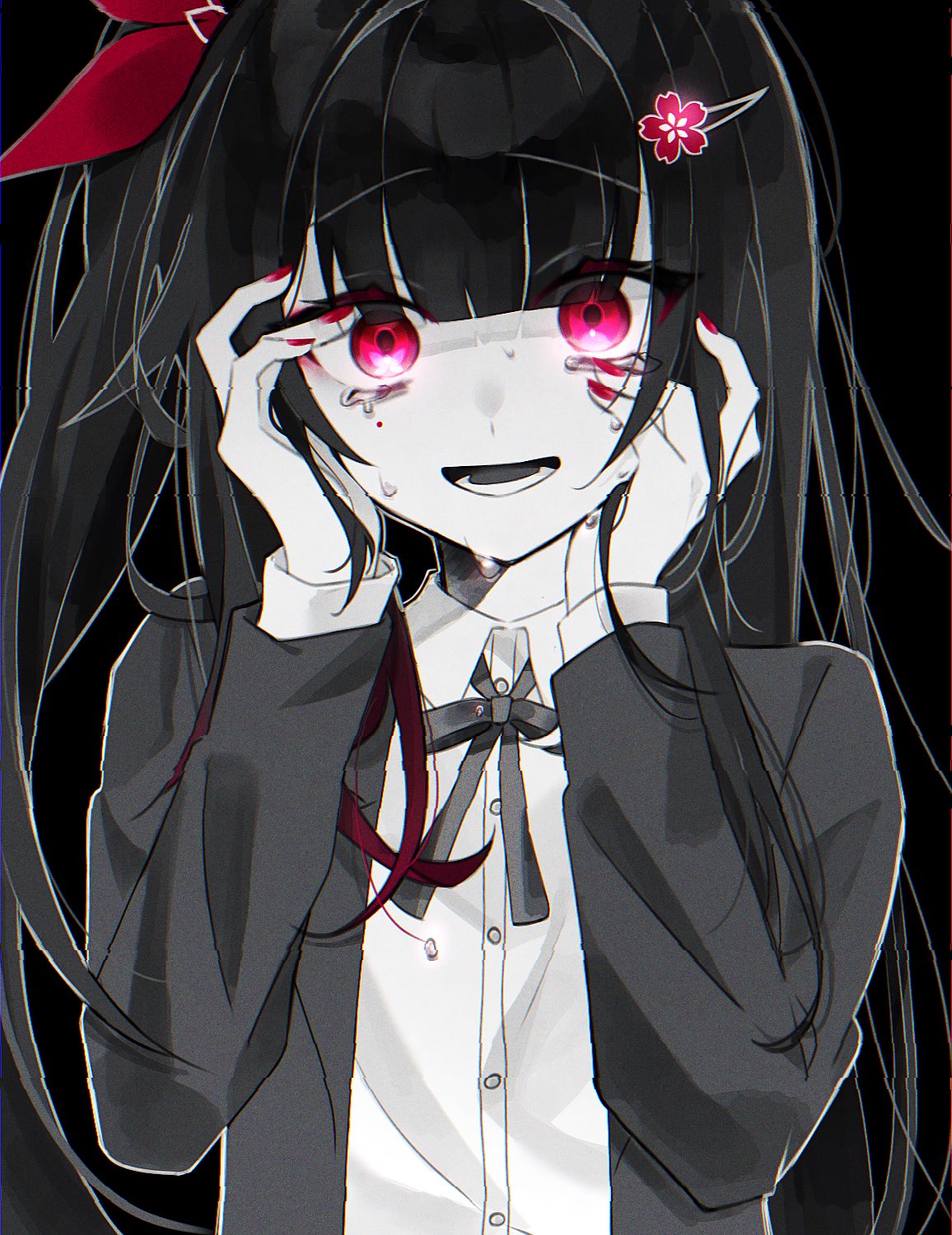 1girl black_background blazer bow collared_shirt crying crying_with_eyes_open glowing glowing_eyes greyscale hair_bow hair_ornament hairclip hands_on_own_cheeks hands_on_own_face highres honkai:_star_rail honkai_(series) jacket long_hair looking_at_viewer monochrome nail_polish open_clothes open_jacket open_mouth pink_eyes red_bow red_nails school_uniform shirt smile solo sparkle_(honkai:_star_rail) spot_color straight-on syarou tears teeth twintails upper_body yandere yandere_trance