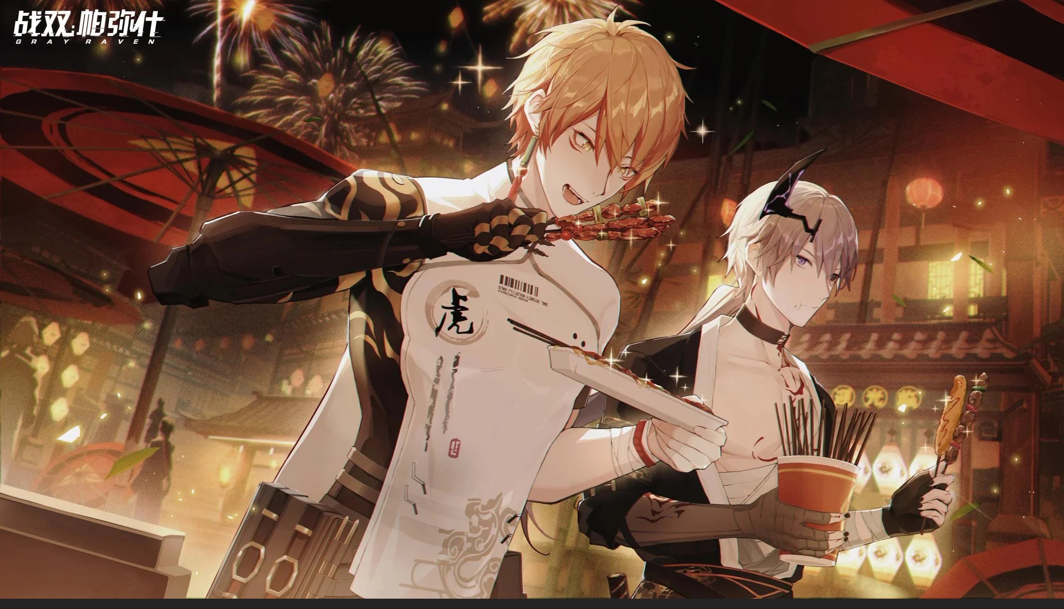 2boys architecture camu:_crocotta_(yaksha_undertow)_(pgr) camu_(pgr) east_asian_architecture food highres holding holding_food kamui:_tenebrion_(pgr) kamui:_tenebrion_(tiger_imperium)_(pgr) kamui_(pgr) multiple_boys official_alternate_costume official_art punishing:_gray_raven shish_kebab