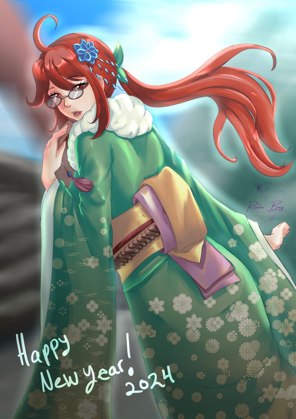 1girl 2024 ahoge english_text floral_print fur-trimmed_kimono fur_trim glasses green_kimono hair_ornament happy_new_year highres japanese_clothes kimono long_hair looking_at_viewer looking_back lorelei_(pokemon) new_year nintendo obi pokemon pokemon:_let's_go_pikachu!_and_let's_go_eevee! ponytail print_kimono red_eyes red_hair rinku_bny sash signature solo swept_bangs wide_sleeves