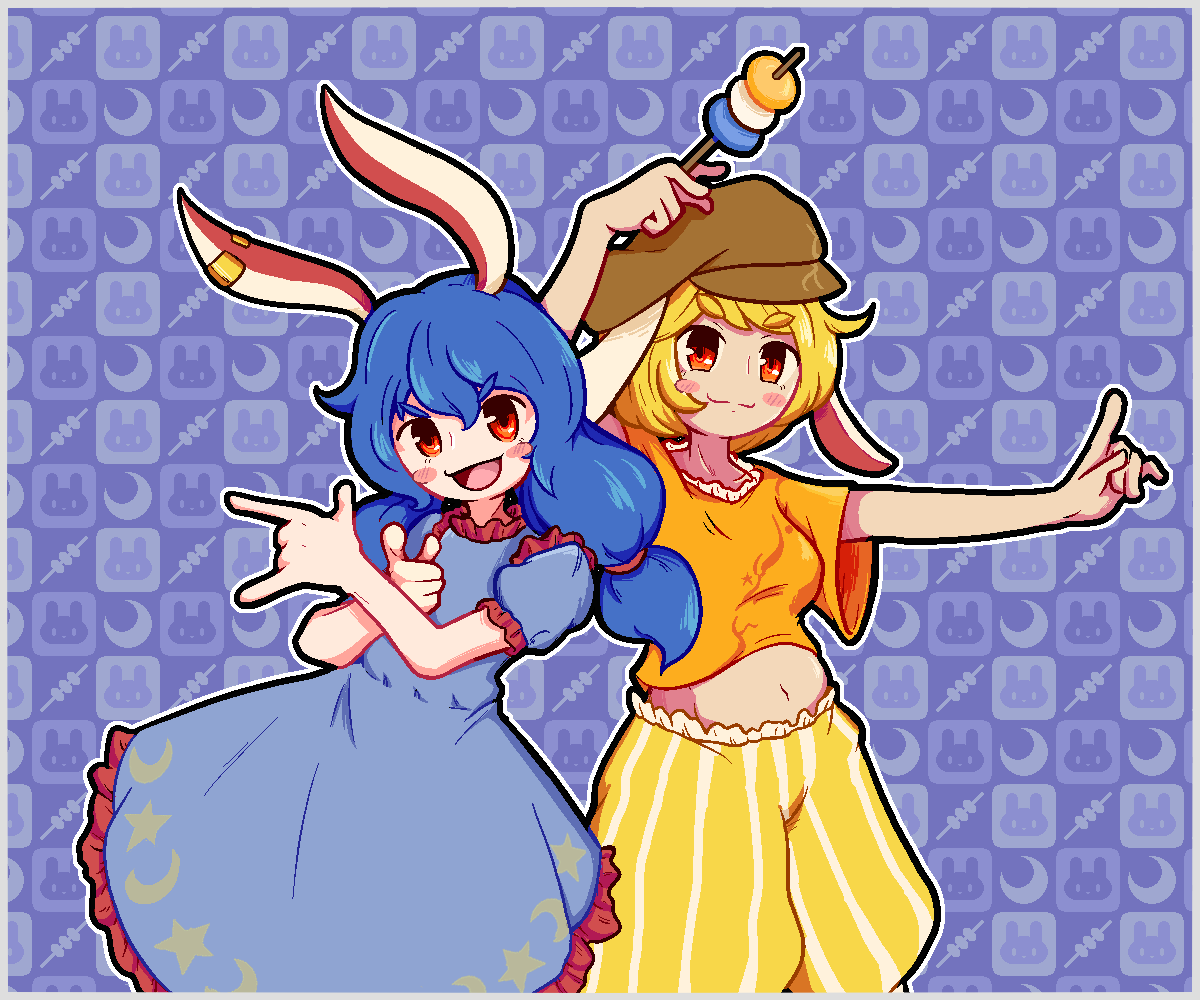 2girls :3 animal_ears bishoujo_senshi_sailor_moon blonde_hair blue_dress blue_hair brown_headwear newsboy_cap closed_mouth dress earclip flat_cap floppy_ears food hat long_hair low_twintails midriff multiple_girls navel open_mouth pointing puffy_short_sleeves puffy_sleeves rabbit_ears rabbit_tail red_eyes ringo_(touhou) seiran_(touhou) shirt short_hair short_sleeves shorts striped_clothes striped_shorts suwa_lagito tail thick_eyebrows touhou twintails upper_body vertical-striped_clothes vertical-striped_shorts wagashi white_shirt yellow_shorts