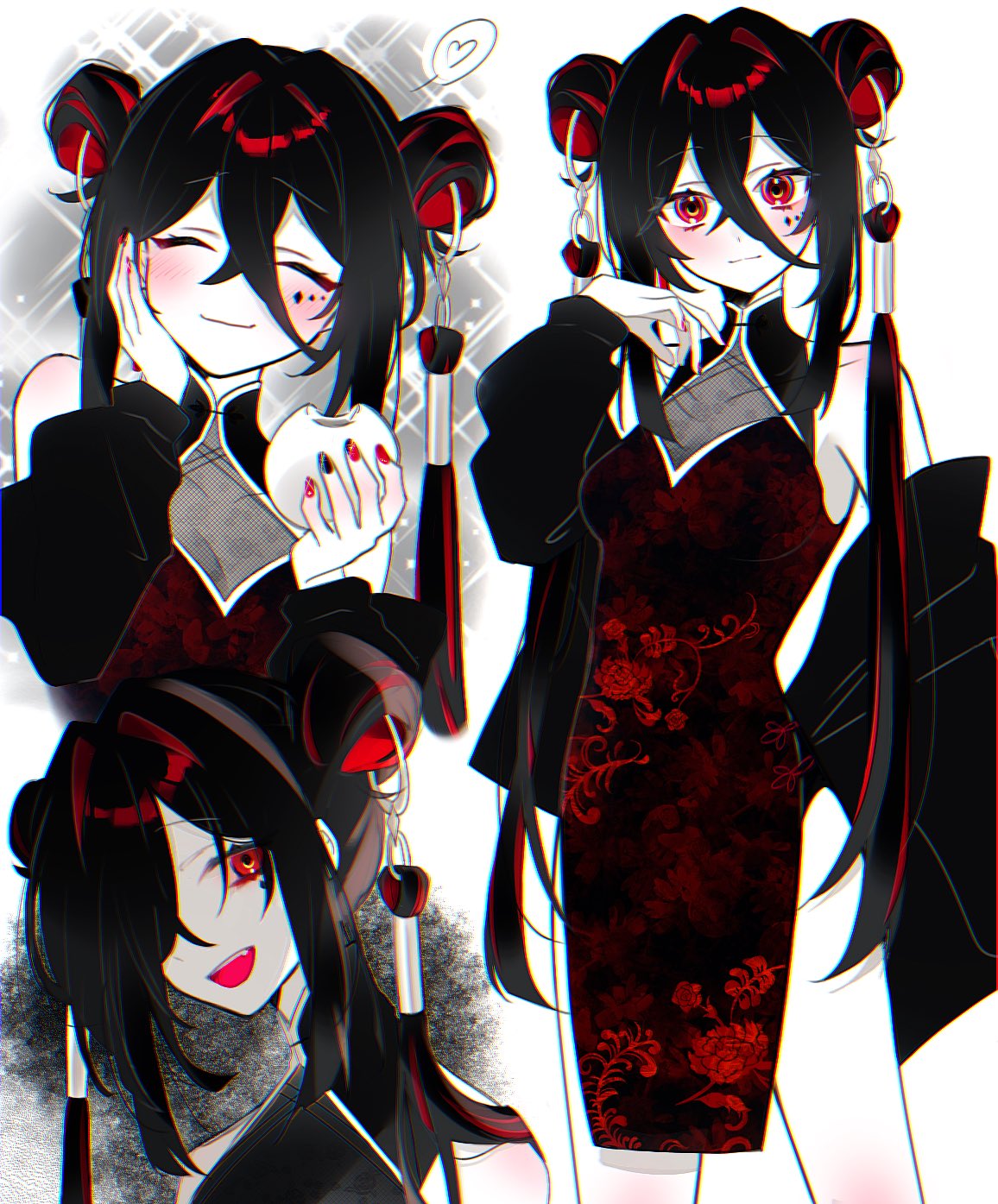 1girl bare_shoulders black_nails blush china_dress chinese_clothes crossed_bangs diamond_(shape) diamond_facial_mark double-parted_bangs double_bun dress facial_mark fang floral_print food hair_between_eyes hair_bun hair_intakes hair_ornament hair_over_one_eye hands_up highres holding holding_food jacket long_hair_between_eyes long_sleeves looking_at_viewer multiple_views nail_polish open_clothes open_jacket open_mouth original partially_colored red_eyes red_nails red_theme sidelocks sparkle sparkling_aura steamed_bun syarou tassel tassel_hair_ornament teeth upper_teeth_only
