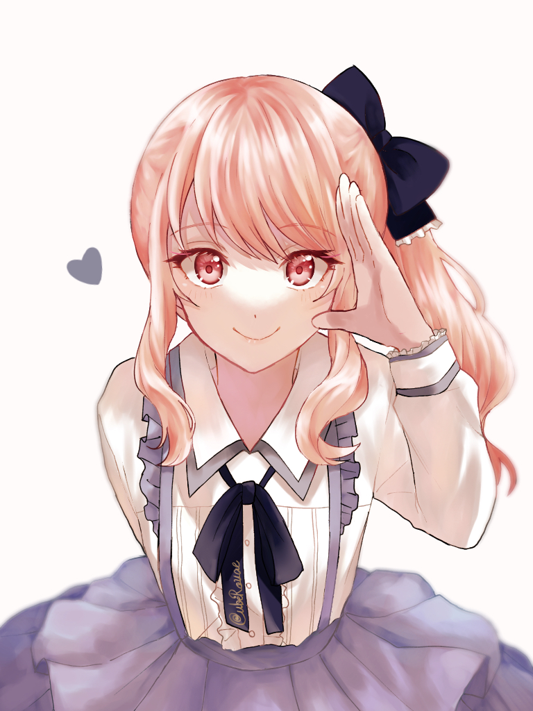 1other akiyama_mizuki arm_behind_back black_bow black_ribbon bow closed_mouth collared_shirt drill_hair drill_ponytail frilled_sleeves frills hair_between_eyes hair_bow hand_on_own_face heart long_hair looking_at_viewer neck_ribbon pink_eyes pink_hair project_sekai purple_skirt ribbon shirt side_ponytail sidelocks simple_background skirt smile suspender_skirt suspenders tsuchinoko_(tuchituchi11) white_background white_shirt