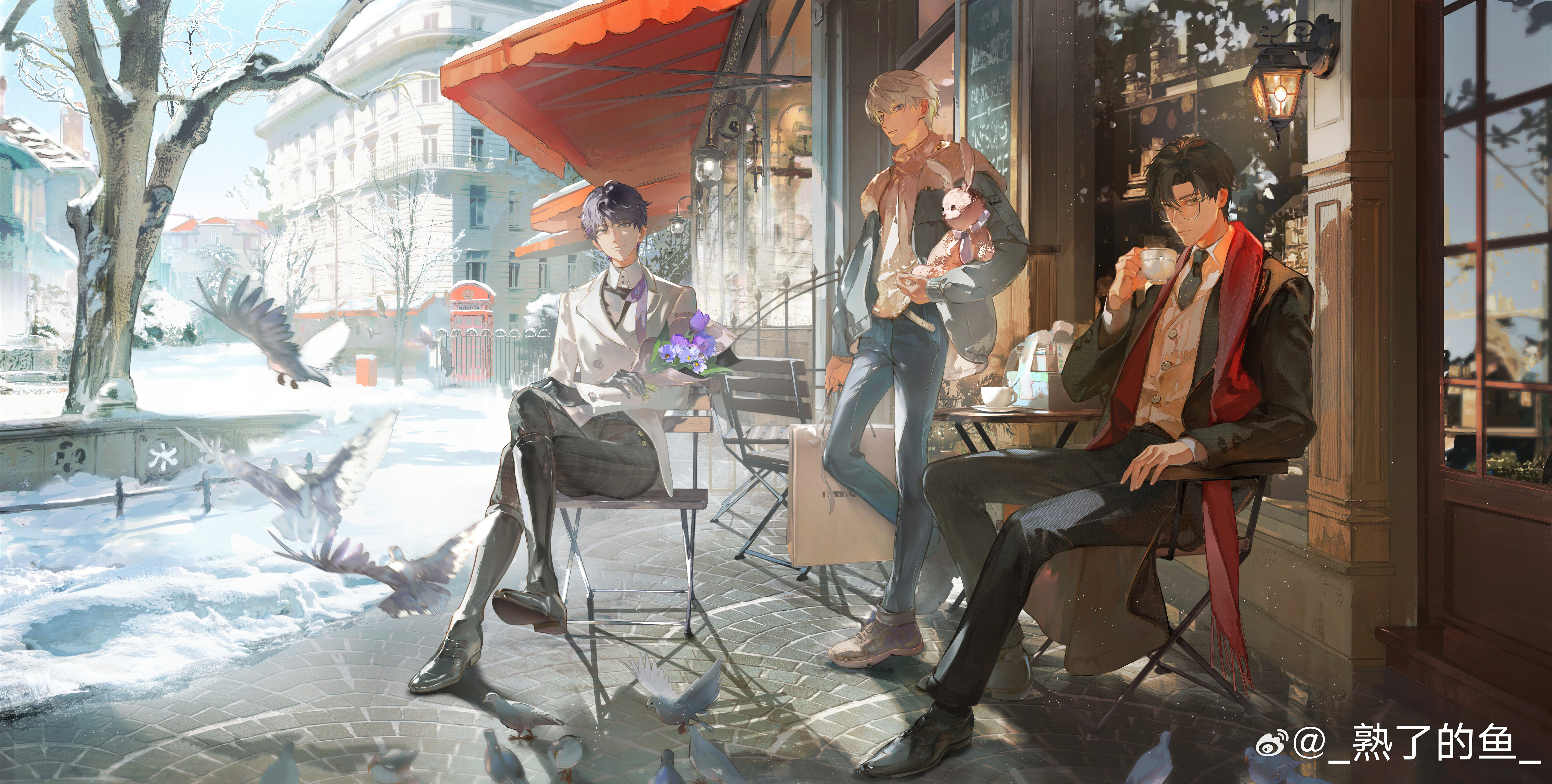 3boys absurdres awning bag bare_tree bird black_footwear black_hair black_jacket black_pants black_suit blazer bouquet building buttons chair chalkboard character_request chinese_commentary closed_mouth collared_shirt crossed_legs cup curtained_hair day denim flower formal_clothes full_body glasses grey_footwear highres holding holding_bag holding_bouquet holding_cup holding_stuffed_toy jacket jeans long_sleeves looking_at_viewer love_and_deepspace male_focus multiple_boys outdoors pants phone_booth pigeon purple_flower purple_tulip red_scarf reflection saucer scarf shadow shirt shoes shopping_bag short_hair shule_de_yu sitting sky sneakers snow standing standing_on_one_leg stone_floor stuffed_animal stuffed_rabbit stuffed_toy suit table teacup tree tulip wall_lamp watermark weibo_watermark white_hair white_jacket white_shirt window winter