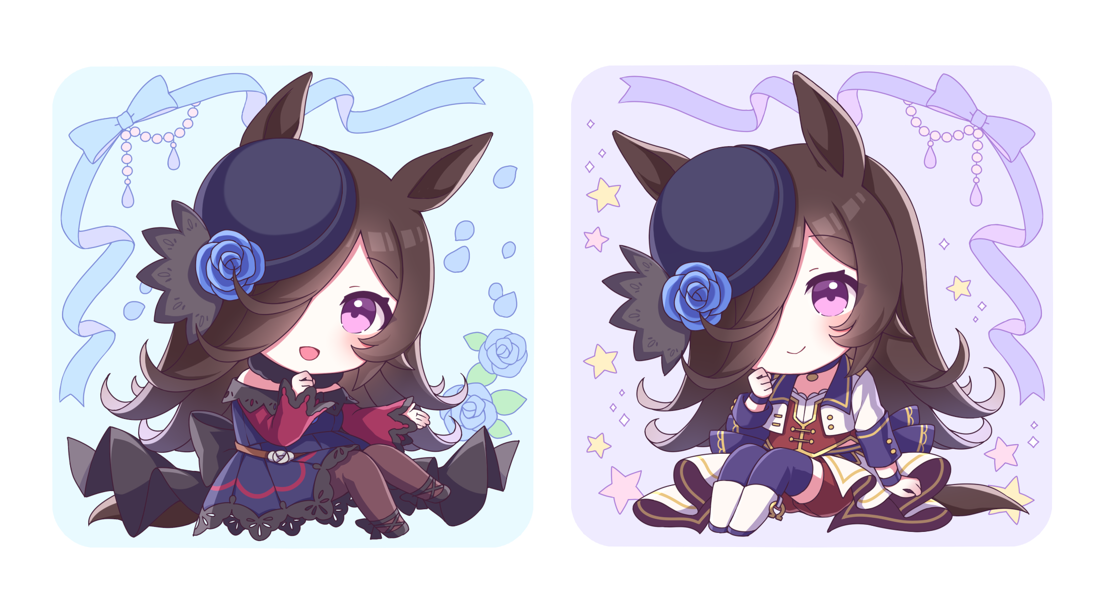 1girl :d animal_ears asymmetrical_bangs black_pantyhose blue_dress blue_flower blue_headwear blue_rose blue_thighhighs brown_hair chibi chibi_only commentary_request dress flower hair_over_one_eye hat hat_flower highres horse_ears horse_girl horse_tail jacket long_bangs long_hair multiple_views off-shoulder_dress off_shoulder open_mouth pantyhose purple_eyes rice_shower_(umamusume) rose sanotsuki short_dress smile starting_future_(umamusume) tail thighhighs tilted_headwear umamusume white_jacket