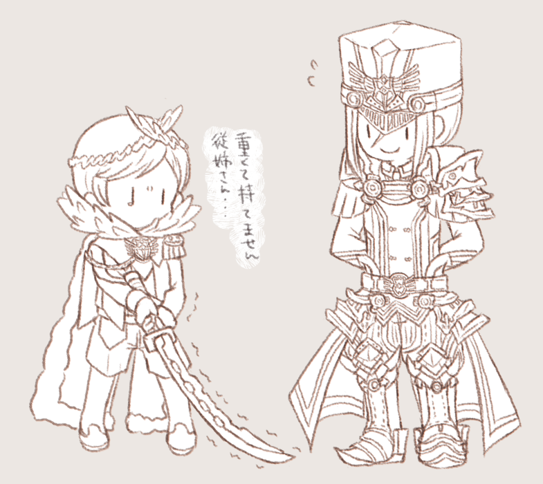 1boy 1girl armor arms_behind_back asozan_(cocomil) boots brother_and_sister closed_mouth epaulettes flying_sweatdrops fur-trimmed_jacket fur_trim grey_background greyscale hair_between_eyes hat holding holding_sword holding_weapon jacket knee_boots military_hat monochrome morag_ladair_(xenoblade) niall_ardanach pauldrons puffy_pants shoulder_armor siblings simple_background single_epaulette single_pauldron smile sword tears translation_request trembling weapon xenoblade_chronicles_(series) xenoblade_chronicles_2 |_|