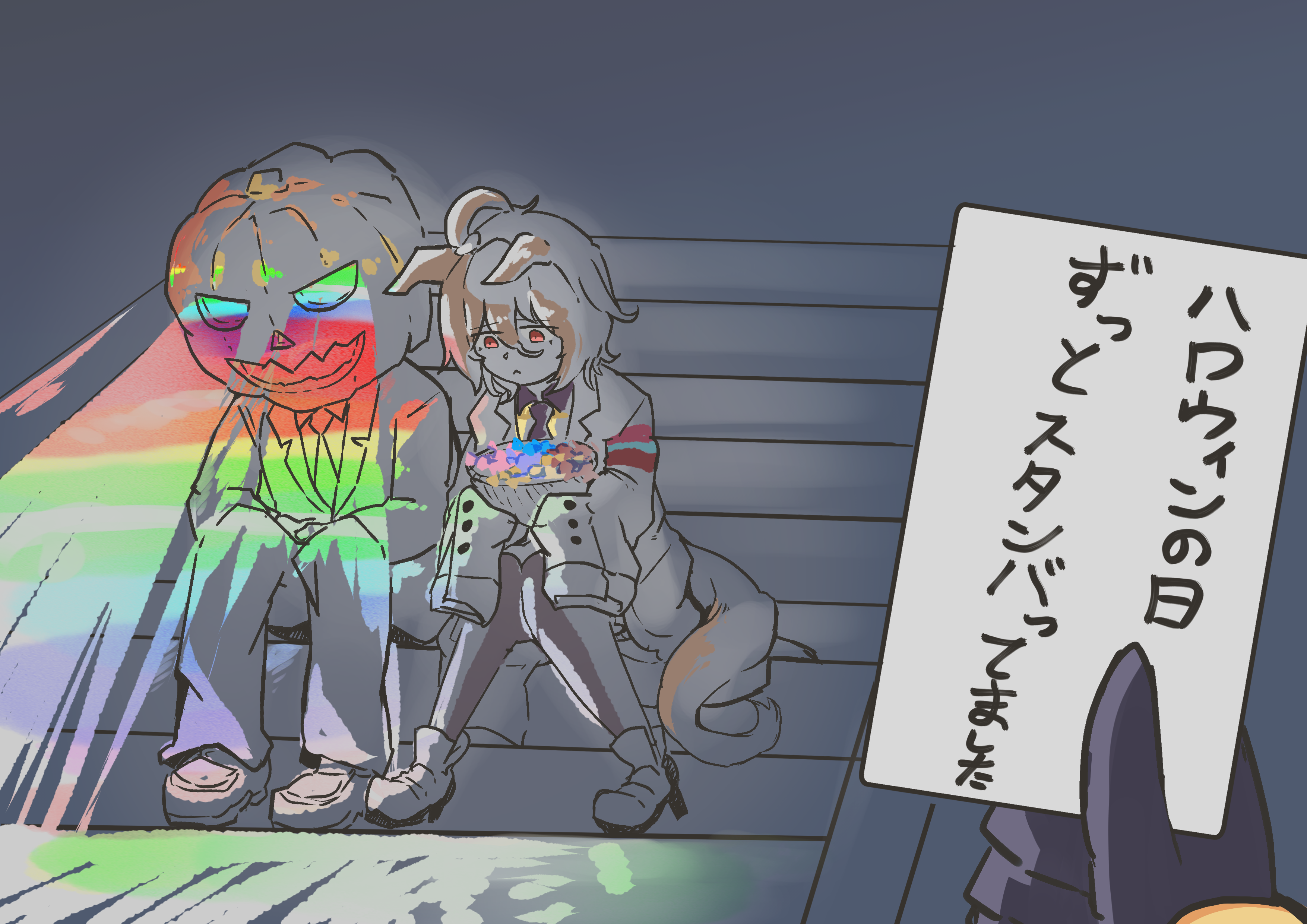 1boy 1girl absurdres agnes_tachyon_(tach-nology)_(umamusume) agnes_tachyon_(umamusume) ahoge animal_ears black_gloves brown_hair commentary_request dark dress_shoes ears_down formal_clothes gloves glowing hair_between_eyes halloween highres horse_ears horse_girl horse_tail jack-o'-lantern jack-o'-lantern_head knees_together_feet_apart lab_coat long_sleeves manhattan_cafe_(umamusume) necktie pantyhose pov pov_hands red_eyes short_hair sitting sitting_on_stairs sleeves_past_fingers sleeves_past_wrists stairs suit tail trainer_(umamusume) translation_request umamusume wingo_(wingo809361131)