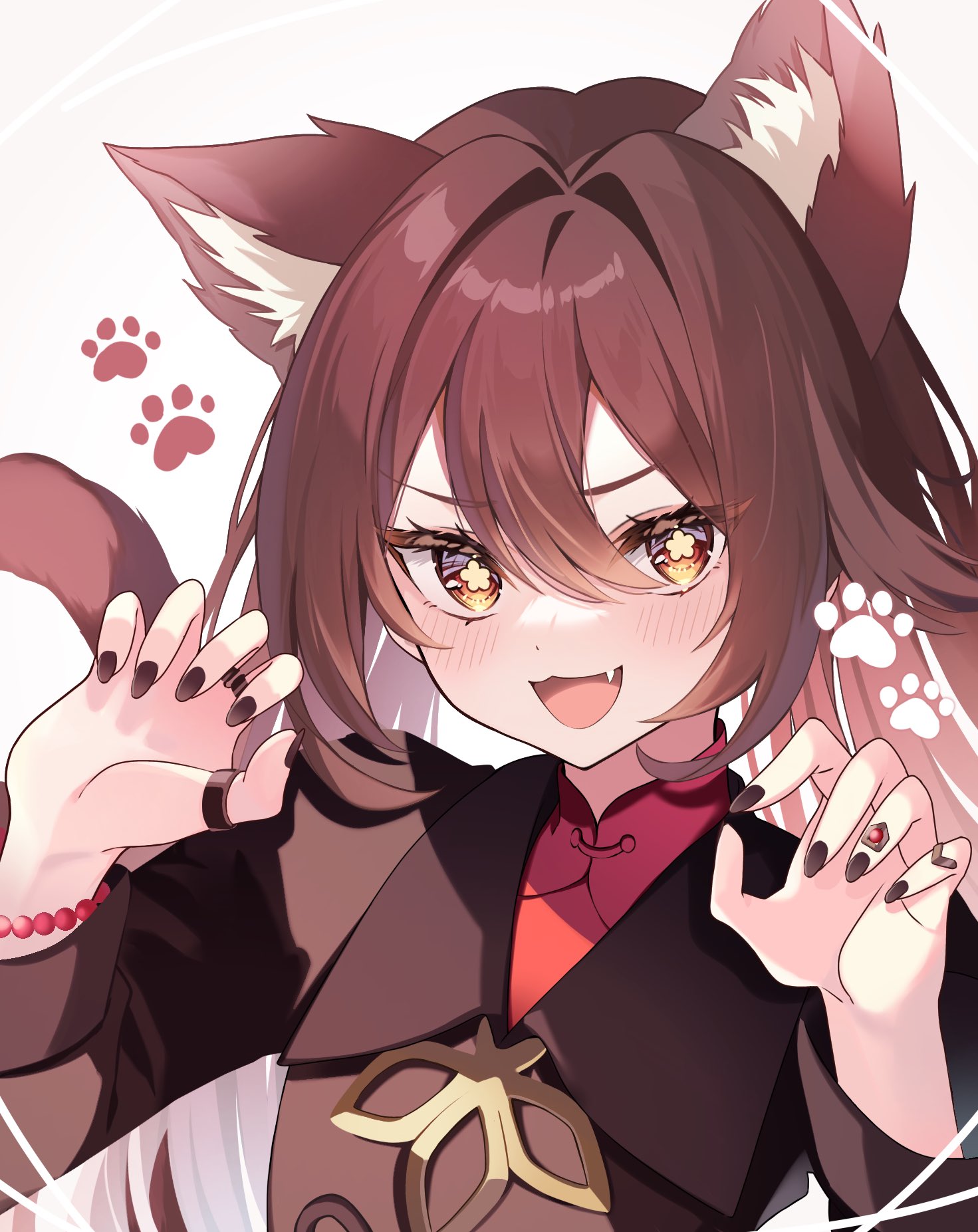 1girl animal_ear_fluff animal_ears armlet black_nails brown_eyes brown_hair cat_ears cat_girl cat_tail chinese_clothes fang flower-shaped_pupils genshin_impact highres hu_tao_(genshin_impact) jewelry long_hair looking_at_viewer multiple_rings pomepome1207 red_shirt ring shirt symbol-shaped_pupils tail white_background white_hair