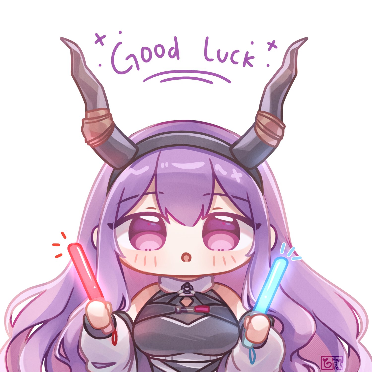1girl :o arknights black_hairband black_shirt blush breasts fake_horns glowstick haaiiro hairband highres holding holding_glowstick horns jacket large_breasts long_hair looking_at_bulge notice_lines off_shoulder open_clothes open_jacket pink_eyes purple_hair shirt sidelocks simple_background sleeveless sleeveless_shirt solo straight-on typhon_(arknights) upper_body white_background white_jacket