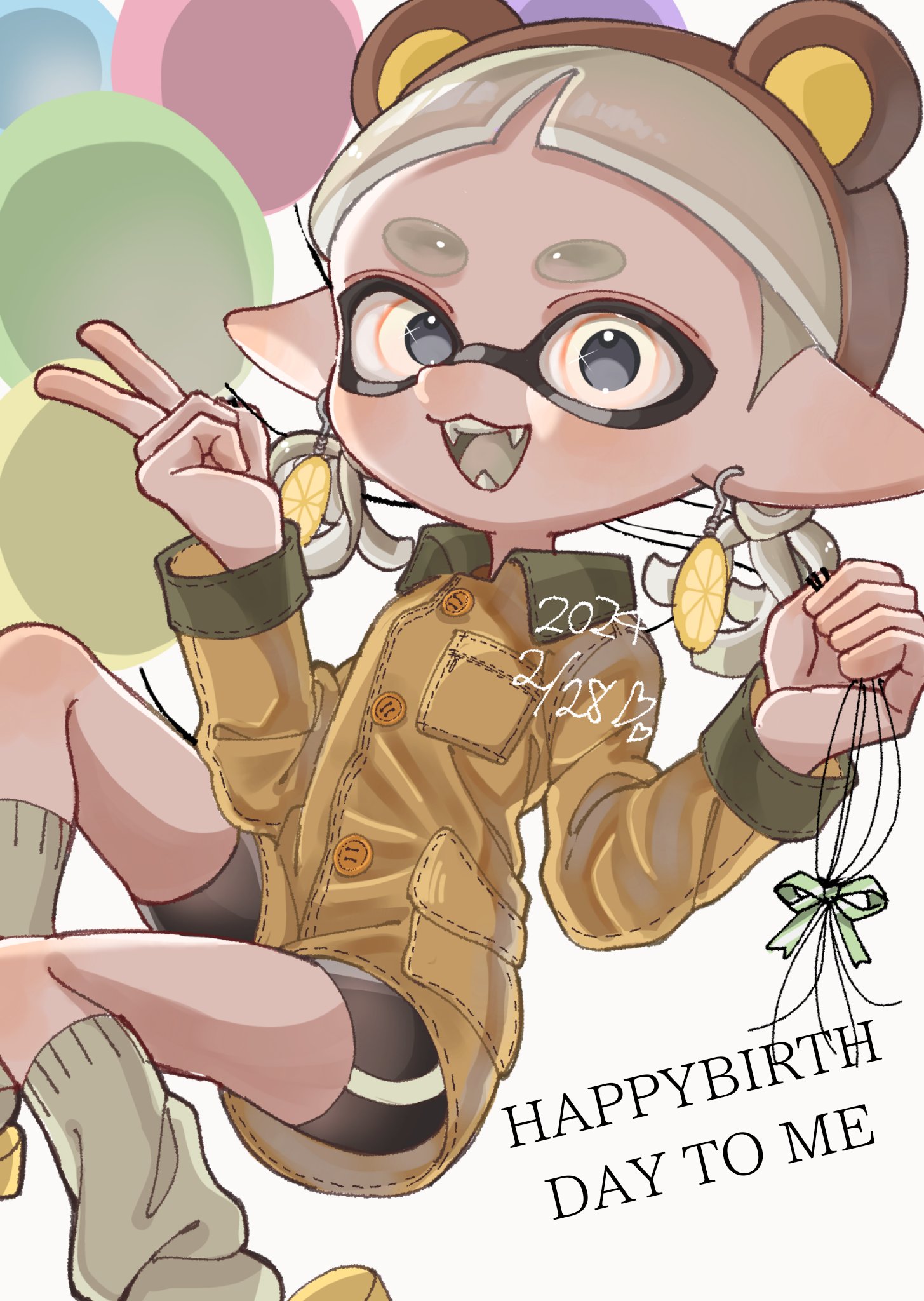 1girl animal_ear_hairband animal_ears balloon bear_ears bike_shorts brown_hairband buttons commentary dated earrings fake_animal_ears food-themed_earrings green_hair grey_socks hairband happy_birthday highres holding holding_balloon inkling inkling_girl inkling_player_character jacket jewelry lemo_(lemo_4) looking_at_viewer medium_hair nintendo open_mouth pointy_ears simple_background smile socks solo splatoon_(series) untranslatable_commentary teeth tentacle_hair thick_eyebrows v white_background yellow_eyes yellow_jacket