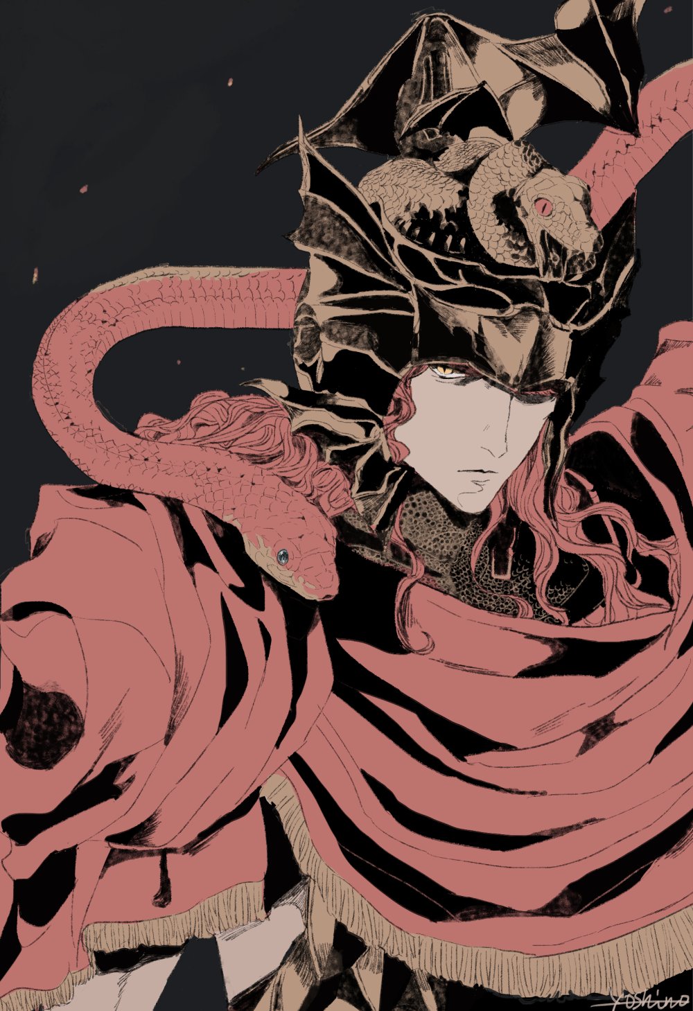 1boy elden_ring elden_ring:_shadow_of_the_erdtree helmet highres long_hair looking_at_viewer messmer_the_impaler one_eye_closed red_robe red_snake robe snake snake_on_shoulder solo winged_helmet yellow_eyes yoshino_(cmkots)