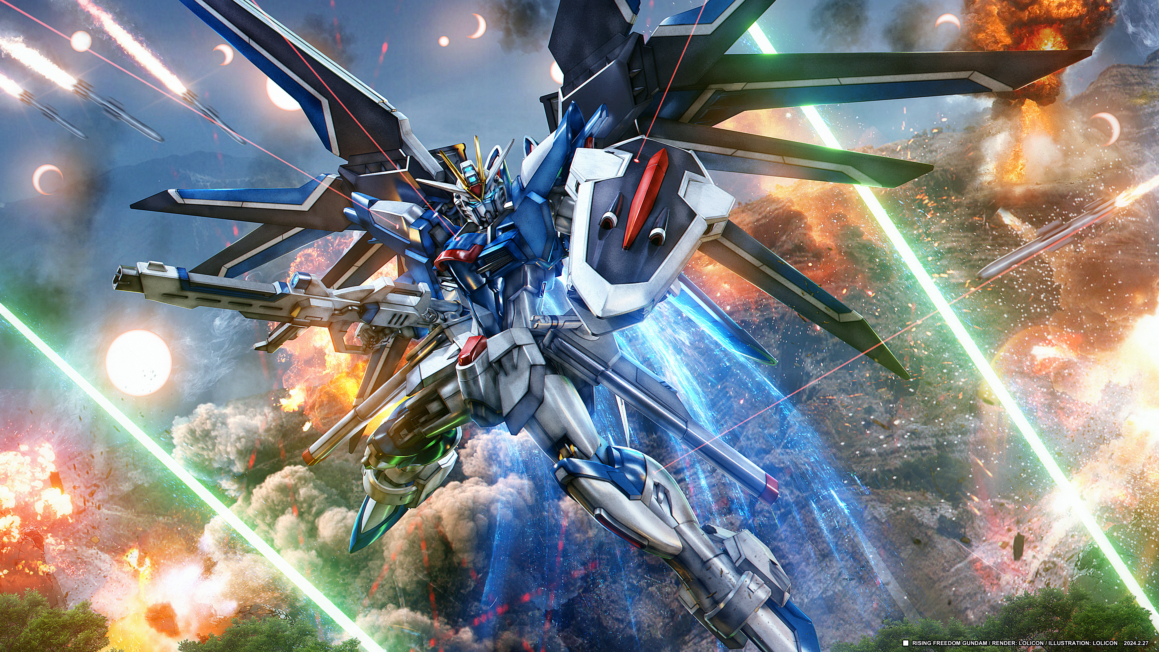 absurdres beam_rifle blue_eyes energy_gun exhaust explosion fire flying full_body glowing glowing_eyes gun gundam gundam_seed gundam_seed_freedom highres holding holding_gun holding_weapon laser legs_apart lolicon_(lolicon42051636) looking_at_viewer mecha mechanical_wings missile mobile_suit mountain no_humans outdoors photoshop_(medium) rising_freedom_gundam robot science_fiction shield smoke sparks tree v-fin war weapon wings