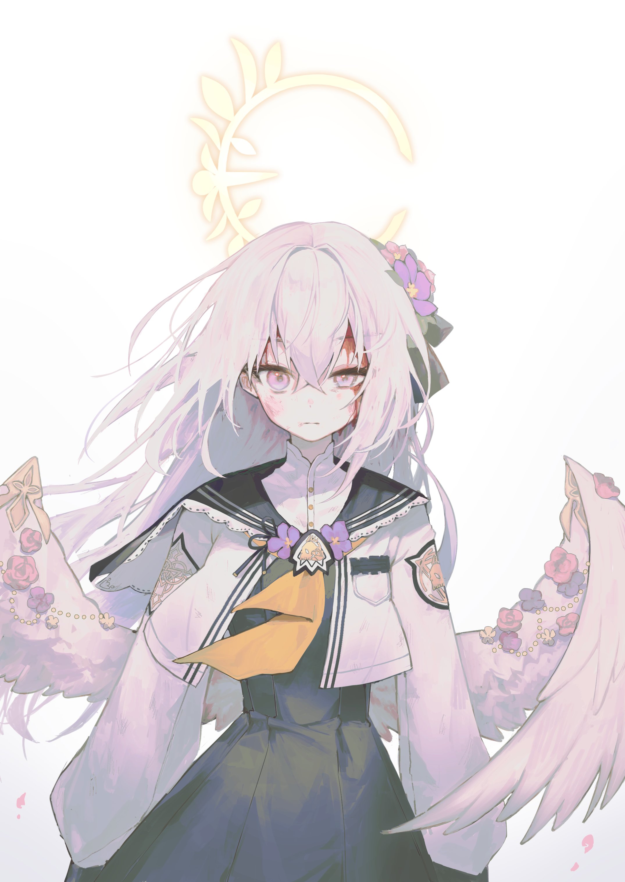 1girl absurdres angel_wings azusa_(blue_archive) black_dress black_sailor_collar blood blood_on_face blue_archive blush dress feathered_wings flower hair_between_eyes hair_flower hair_ornament half-closed_eye highres jacket long_hair long_sleeves looking_at_viewer open_clothes open_jacket pink_eyes purple_flower sailor_collar solo white_hair white_jacket white_wings wings yagiusagi