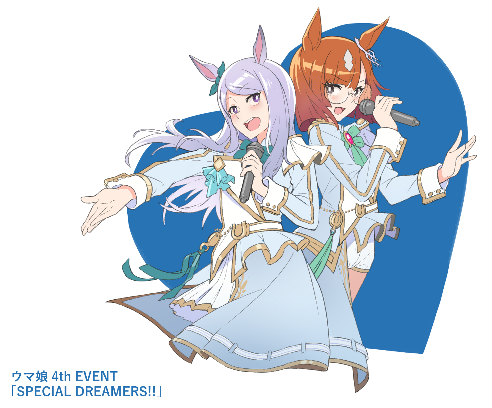 2girls animal_ears belt blush bow bowtie brooch brown_eyes coat commentary cropped_legs ear_bow english_commentary epaulettes glasses hand_up highres holding holding_microphone horse_ears horse_girl horse_tail ikuno_dictus_(umamusume) jewelry long_sleeves looking_at_viewer mejiro_mcqueen_(umamusume) microphone multiple_girls official_alternate_costume open_mouth orange_hair outstretched_arm purple_eyes purple_hair round_eyewear shorts single_epaulette sinnra_art skirt smile tail umamusume white_coat white_shorts white_skirt