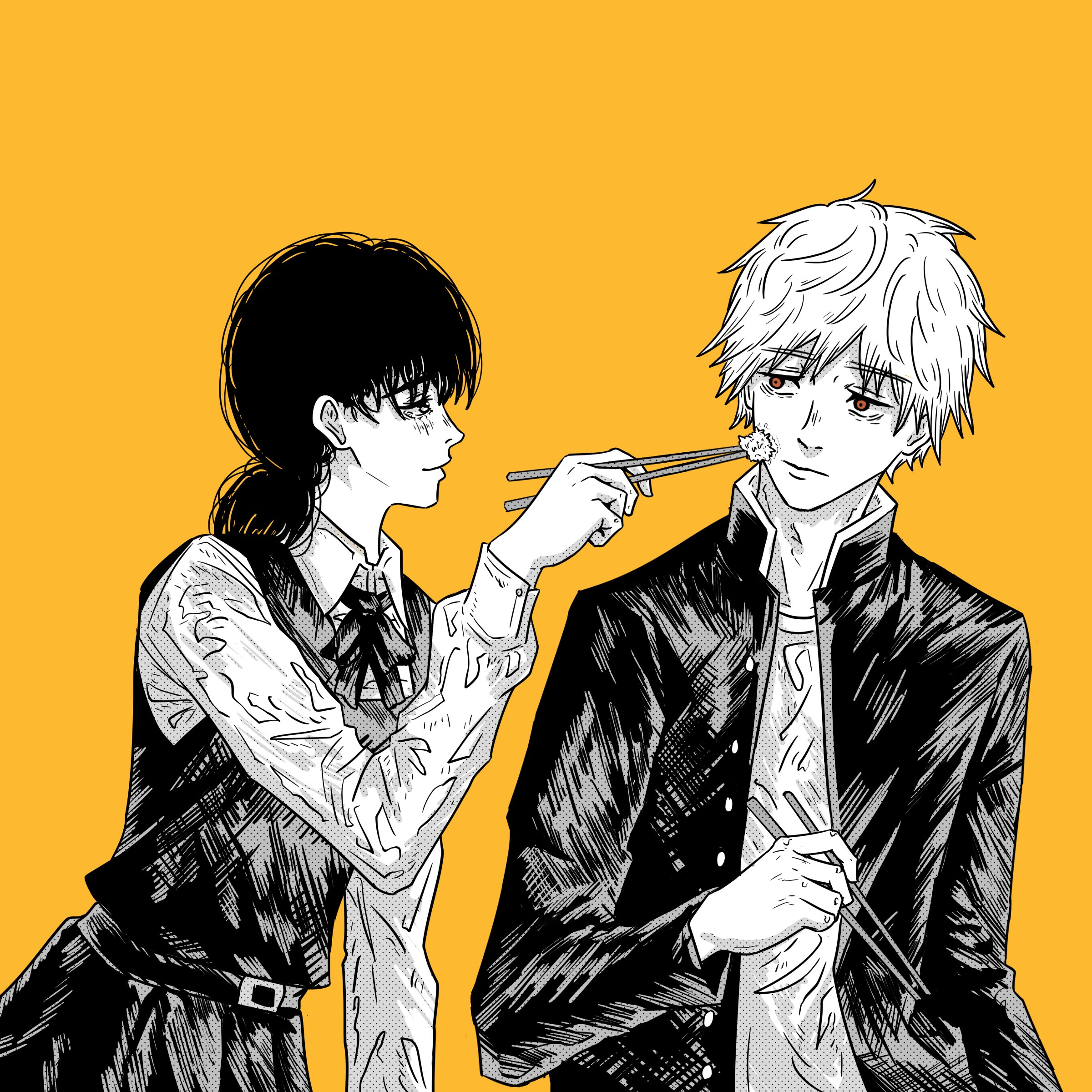 1boy 1girl absurdres blush chainsaw_man chopsticks denji_(chainsaw_man) highres mitaka_asa raggumba school_uniform
