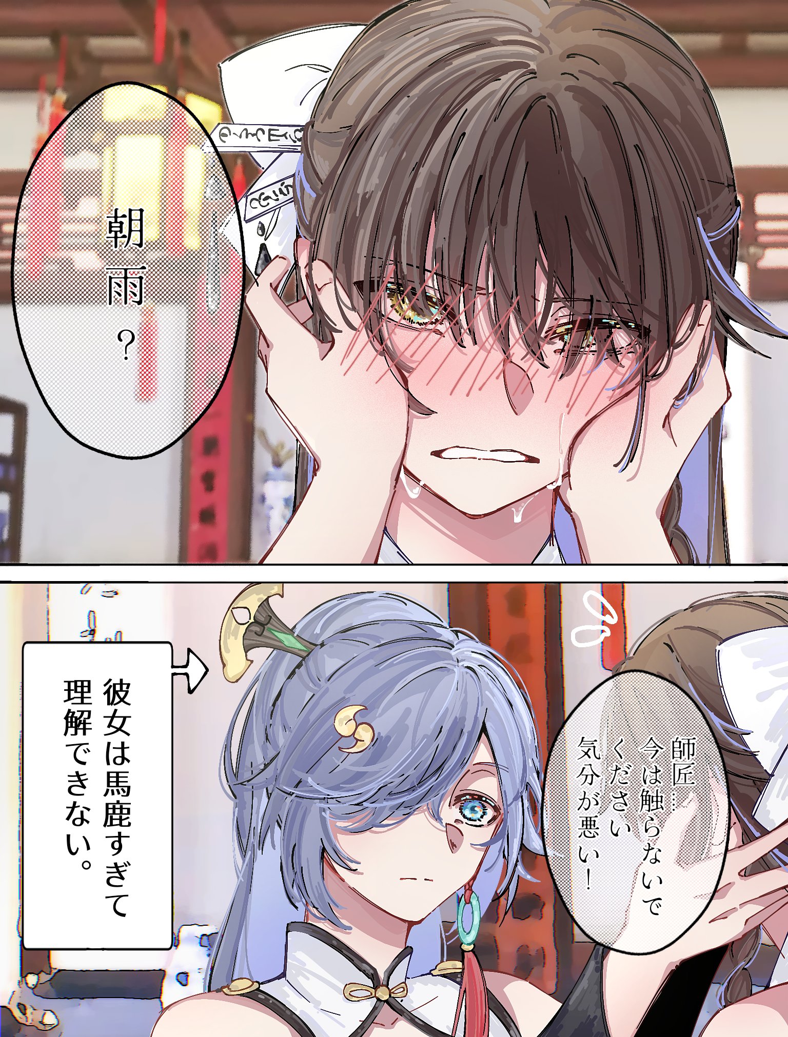 2girls bare_shoulders bird_hair_ornament black_hair blue_eyes blue_hair blush china_dress chinese_clothes chinese_text cleavage_cutout closed_mouth clothing_cutout dress earrings eyes_visible_through_hair fu_hua fu_hua_(azure_empyrea) grey_hair hair_between_eyes hair_ornament hair_over_eyes hair_over_one_eye hairpin hands_on_another's_cheeks hands_on_another's_face hanfu hanging_scroll high_ponytail highres honkai_(series) honkai_impact_3rd jewelry lin_zhaoyu long_hair looking_at_another multicolored_hair multiple_girls paintbrush paintbrush_hair_ornament par_sato parted_lips ponytail ribbon scroll shoulder_cutout simplified_chinese_text single_earring speech_bubble streaked_hair sweat tassel tassel_earrings white_dress white_hanfu white_ribbon