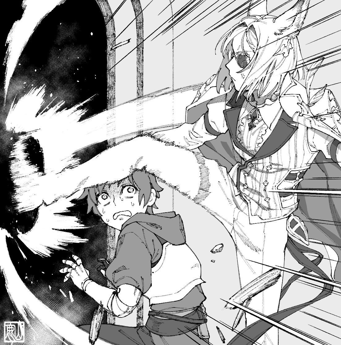 2boys anger_vein angry animal_ears asymmetrical_eyewear bob_cut brooch center_frills choppy_bangs cuirass door dress_shirt erune foot_out_of_frame frilled_shirt_collar frills gauntlets glasses gran_(granblue_fantasy) granblue_fantasy greyscale heterochromatic_eyewear hood hood_down hooded_shirt jacket jacket_on_shoulders jewelry kicking lapel_pin looking_at_another looking_up lu_woh_(granblue_fantasy) male_focus monochrome motion_blur multiple_boys official_alternate_costume opaque_glasses pants parted_bangs pinstripe_pattern pinstripe_vest profile scared shirt shoes short_hair sleeve_garter squatting standing sweatdrop thigh_strap tinted_eyewear triple_bambi vest