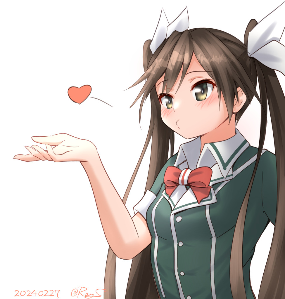 1girl black_hair blowing_kiss bow bowtie brown_eyes green_shirt heart kantai_collection long_hair military_uniform one-hour_drawing_challenge ray.s red_bow red_bowtie shirt simple_background solo tone_(kancolle) tone_kai_ni_(kancolle) upper_body white_background