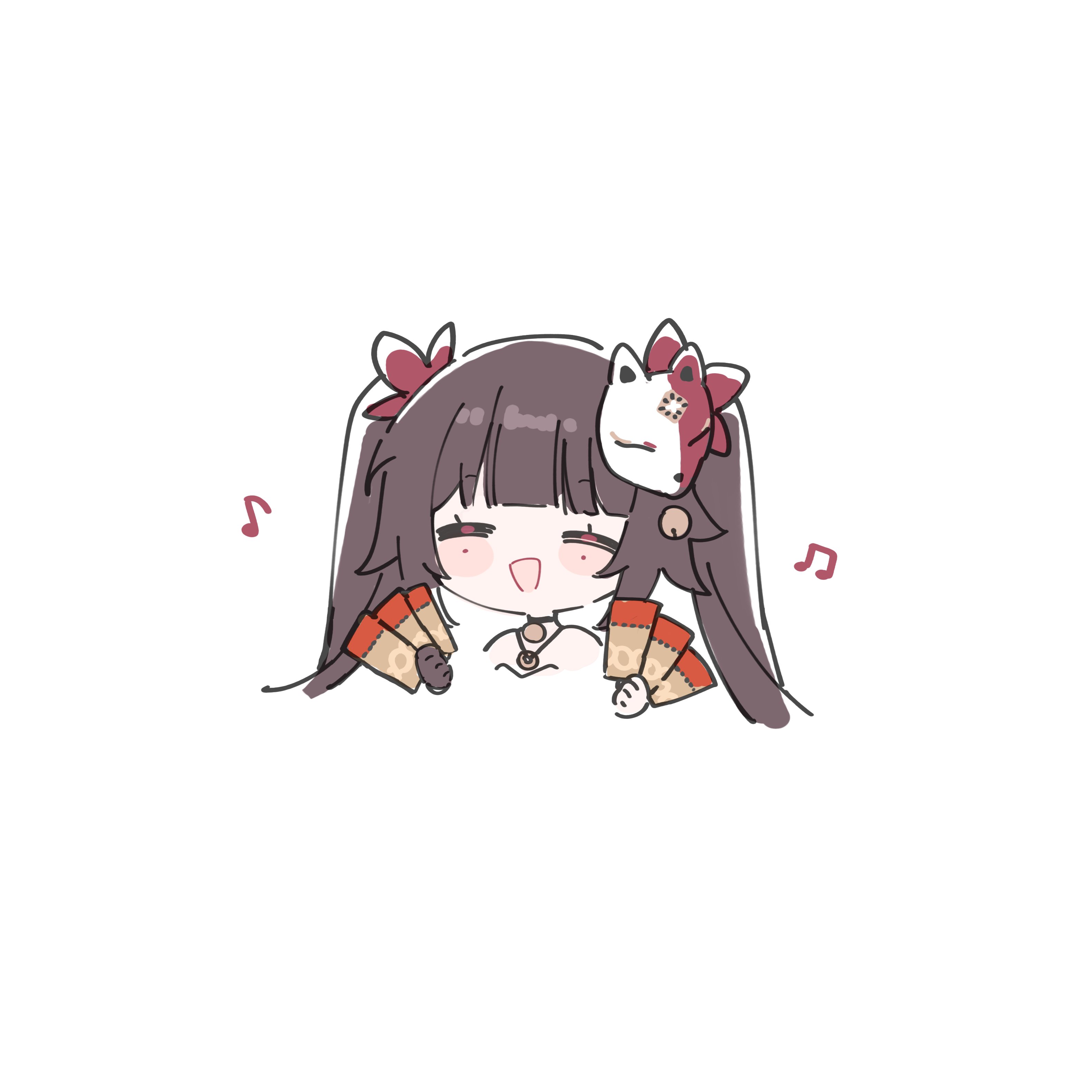 1girl ^_^ absurdres bare_shoulders black_hair blunt_bangs blush chibi closed_eyes commentary_request facial_mark fox_mask highres holding honkai:_star_rail honkai_(series) kumiya mask mask_on_head musical_note solo sparkle_(honkai:_star_rail) star_rail_special_pass_(honkai:_star_rail) twintails