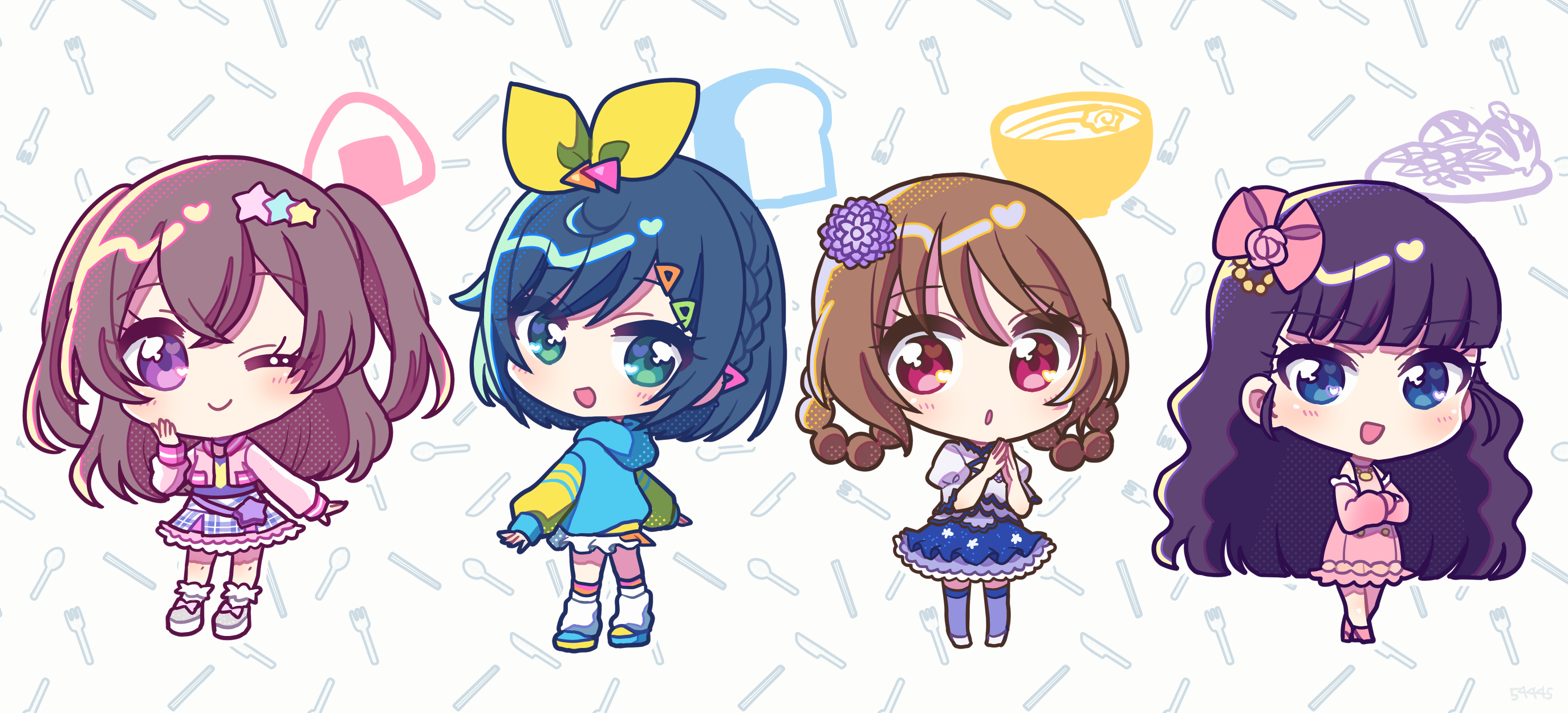4girls :d :o black_hair blue_eyes blue_hair blue_jacket blue_skirt blunt_bangs bow bowl bread brown_hair chibi closed_mouth cosplay crossed_arms delicious_party_precure dress flower food full_body fuwa_kokone hair_bow hair_flower hair_ornament hair_rings hanamichi_ran hanazono_shuka hanazono_shuka_(cosplay) hand_up hands_up highres hood hood_down jacket kasai_amane koda_michiru koda_michiru_(cosplay) koyoshi_yoko long_hair long_sleeves looking_at_viewer multiple_girls nagomi_yui nijiiro_nino nijiiro_nino_(cosplay) onigiri open_mouth own_hands_together pink_bow pink_dress pink_jacket precure purple_eyes purple_flower purple_skirt shoes short_hair skirt smile standing star_(symbol) star_hair_ornament two_side_up wavy_hair yellow_bow yumekawa_yui yumekawa_yui_(cosplay)