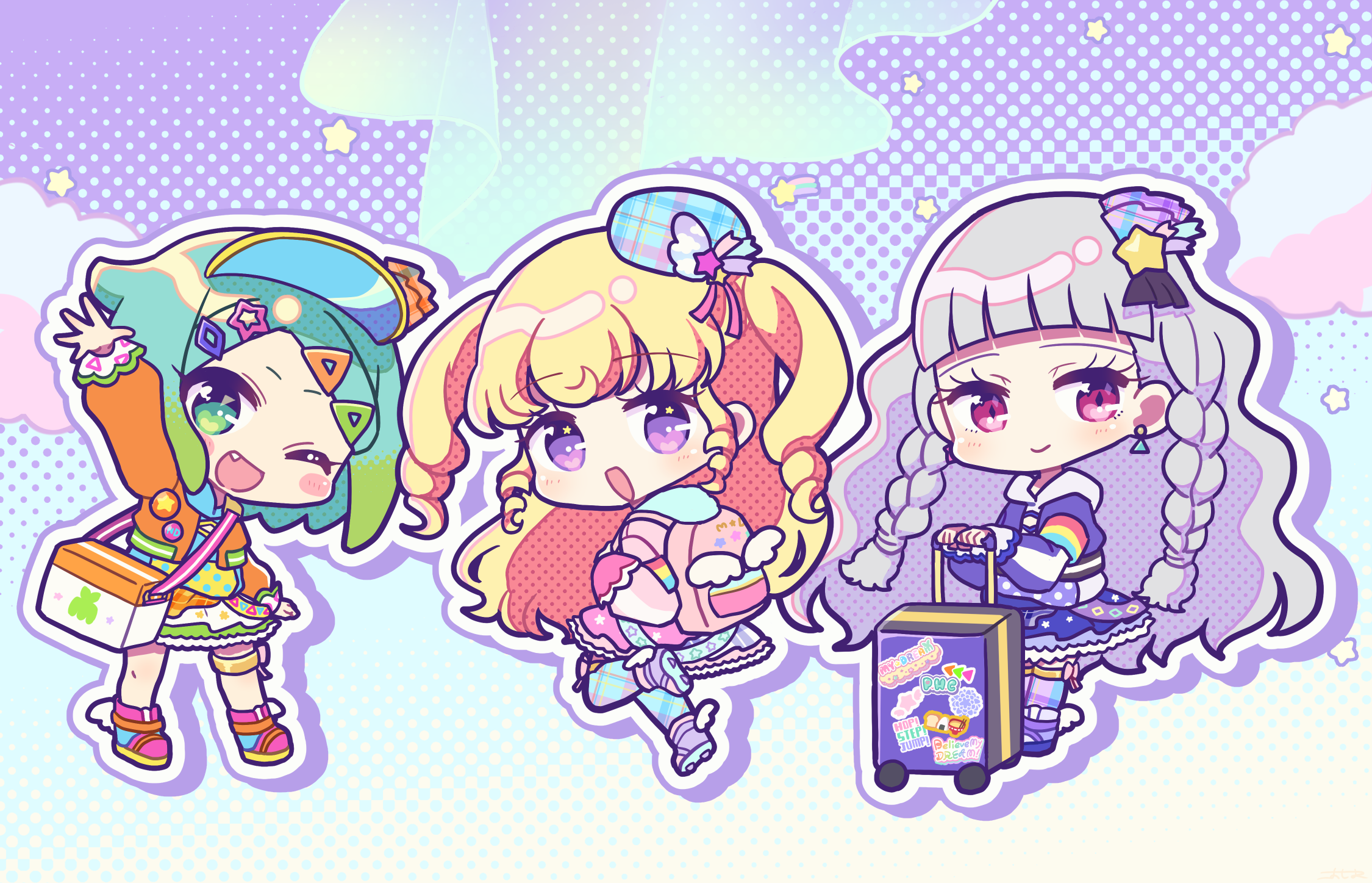3girls :d ;d arm_up backpack bag blonde_hair blue_hair blue_headwear blunt_bangs blush braid chibi closed_mouth fairy_kei fang frilled_skirt frills full_body gradient_hair green_eyes green_hair grey_hair hat highres holding holding_suitcase idol_time_pripara jacket koda_michiru koyoshi_yoko long_hair long_sleeves looking_at_viewer looking_back miichiru_(pripara) multicolored_hair multiple_girls nijiiro_nino one_eye_closed open_mouth orange_jacket pink_bag pink_jacket pink_shoes pretty_series pripara purple_eyes purple_skirt red_eyes ringlets rolling_suitcase shoes short_hair skirt smile standing star_(symbol) suitcase twin_braids two_side_up very_long_hair visor_cap wavy_hair yume_kawaii yumekawa_yui