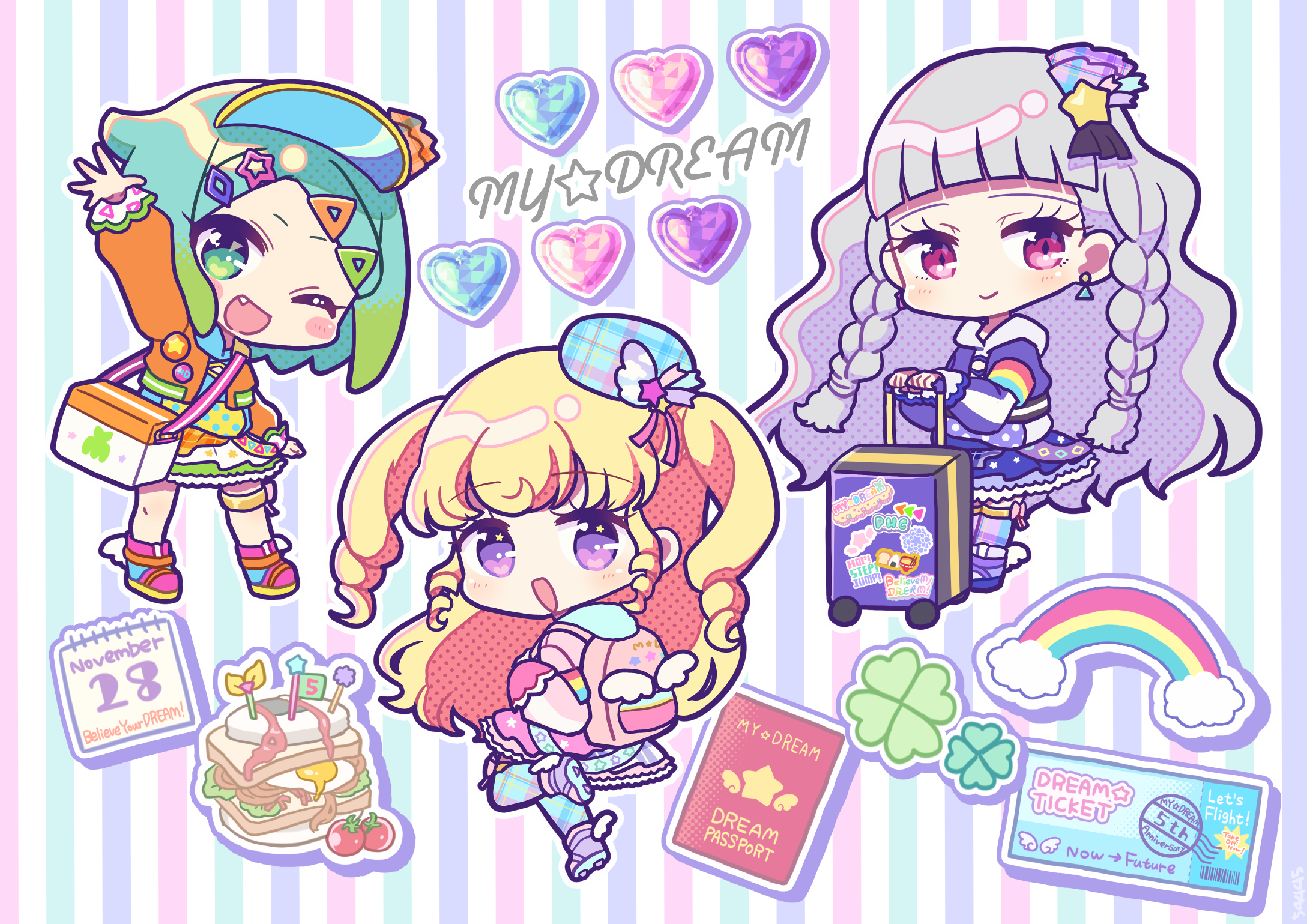 3girls :d ;d arm_up backpack bag blonde_hair blue_hair blue_headwear blunt_bangs blush braid calendar_(object) chibi closed_mouth clover fairy_kei fang food four-leaf_clover frilled_skirt frills full_body gradient_hair green_eyes green_hair grey_hair group_name hat heart highres holding holding_suitcase idol_time_pripara jacket koda_michiru koyoshi_yoko long_hair long_sleeves looking_at_viewer looking_back miichiru_(pripara) multicolored_hair multiple_girls nijiiro_nino one_eye_closed open_mouth orange_jacket passport pink_bag pink_jacket pink_shoes pretty_series pripara purple_eyes purple_skirt rainbow red_eyes ringlets rolling_suitcase sandwich shoes short_hair skirt smile standing standing_on_one_leg star_(symbol) suitcase ticket twin_braids two_side_up very_long_hair visor_cap wavy_hair yume_kawaii yumekawa_yui