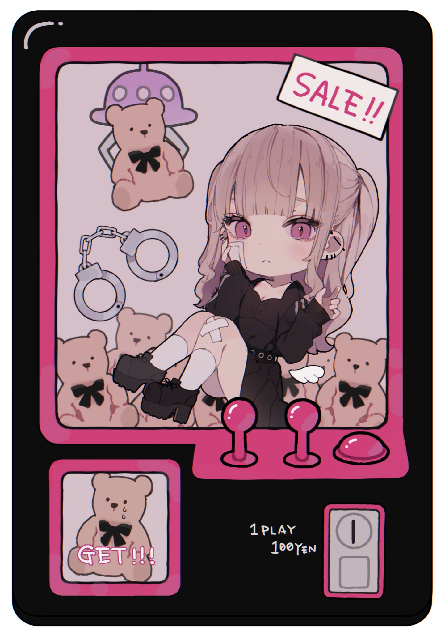 1girl bandaid bandaid_on_face bandaid_on_knee bandaid_on_leg barbell_piercing black_shirt black_skirt blush crane_game detached_wings ear_piercing full_body grey_hair hamunezuko_(nezukonezu32) highres industrial_piercing long_hair looking_at_viewer mini_wings original piercing pink_eyes platform_footwear platform_heels shirt sitting skirt solo stuffed_animal stuffed_toy teddy_bear wings
