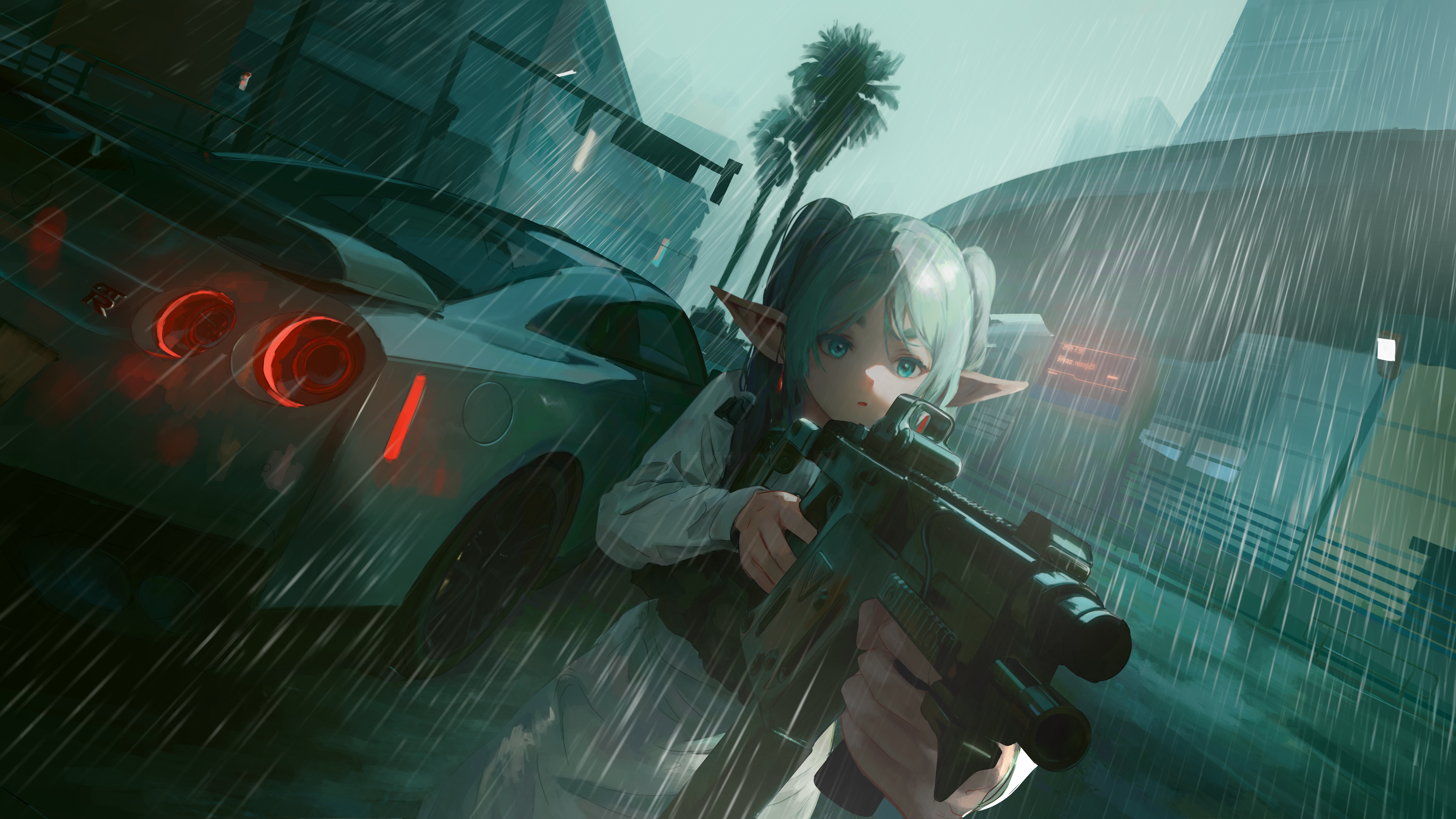 1girl absurdres anachronism assault_rifle black_vest building car city cloud cloudy_sky commentary earrings elf floating_earrings frieren green_eyes grey_hair gun highres holding holding_gun holding_weapon jewelry making-of_available motor_vehicle nissan nissan_gt-r outdoors palm_tree pointy_ears rain rifle sky solo sousou_no_frieren traffic_light tree twintails vest weapon wet yao_liao_wang