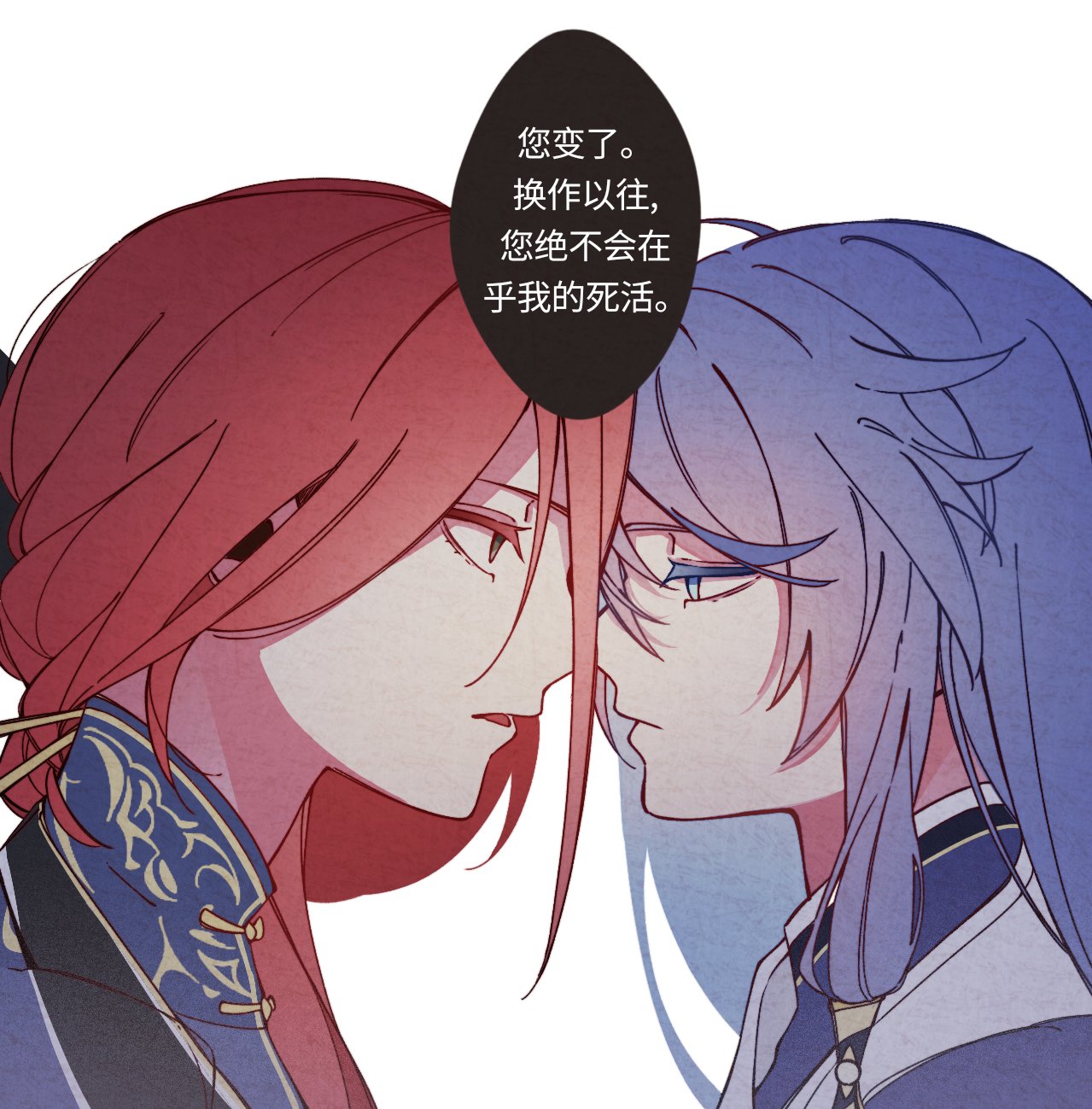 2girls black_bow blue_eyes blue_hair blue_hanfu bow brown_eyes china_dress chinese_clothes chinese_text closed_mouth dress face-to-face fu_hua fu_hua_(azure_empyrea) fu_hua_(taixuan_impression) grey_hair hair_between_eyes hair_ornament hanfu highres honkai_(series) honkai_impact_3rd long_hair looking_at_another multicolored_dress multiple_girls official_alternate_costume par_sato parted_lips red_hair shirt simple_background simplified_chinese_text speech_bubble su_mei white_background white_hanfu white_shirt