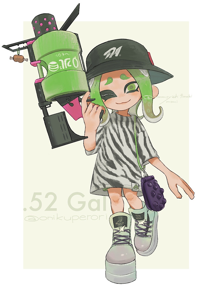 .52_gal_(splatoon) 1girl animal_print black_hat black_shirt border commentary cross-laced_footwear full_body gradient_hair green_eyes green_hair grey_shoes gun hat highres holding holding_gun holding_weapon looking_at_viewer medium_hair multicolored_hair nintendo octoling octoling_girl octoling_player_character one_eye_closed open_mouth outside_border oversized_clothes oversized_shirt raised_eyebrows shirt shoes simple_background smile solo splatoon_(series) splatoon_3 standing standing_on_one_leg untranslatable_commentary tentacle_hair thick_eyebrows totocosakana two-tone_shirt weapon white_border white_shirt yellow_background zebra_print