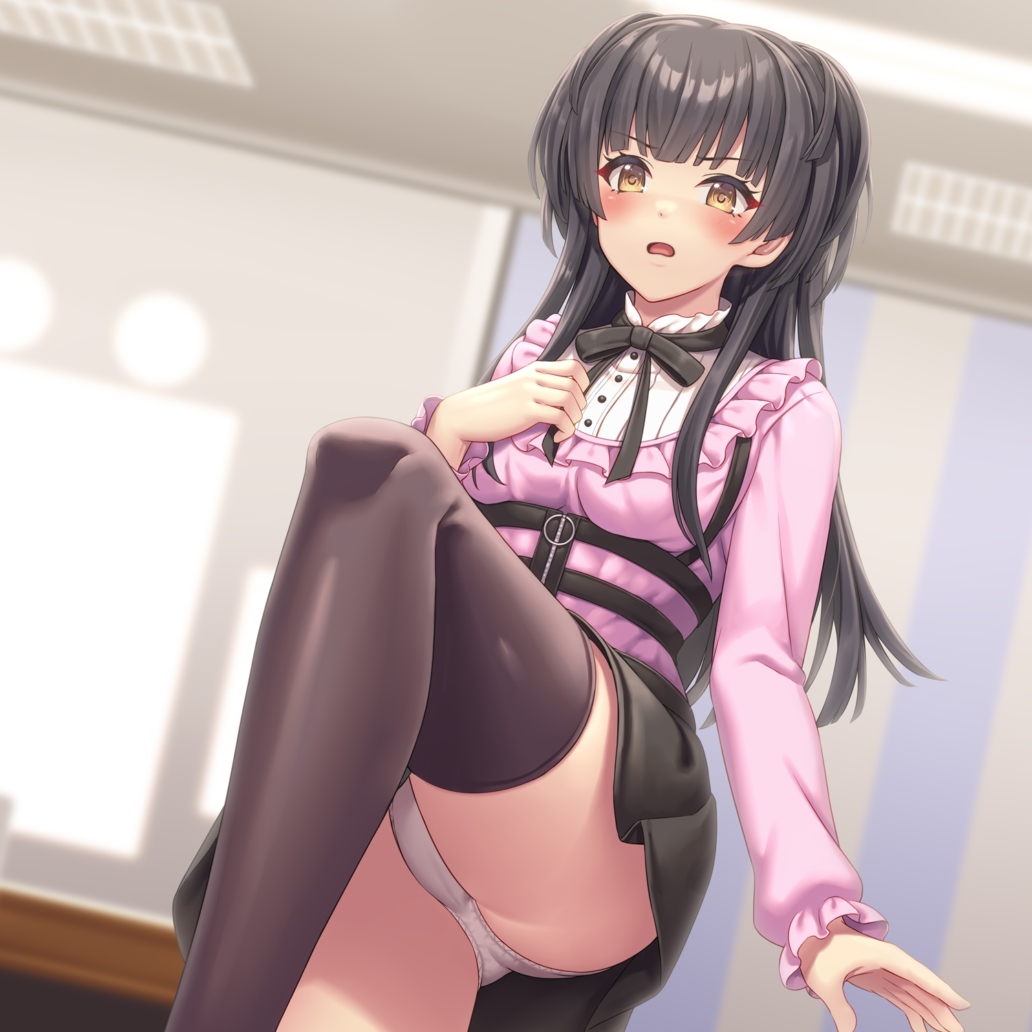 1girl asisuki askask20112 black_hair highres idolmaster idolmaster_shiny_colors jirai_kei mayuzumi_fuyuko neck_ribbon paid_reward_available panties ribbon skirt solo thighhighs underwear yellow_eyes