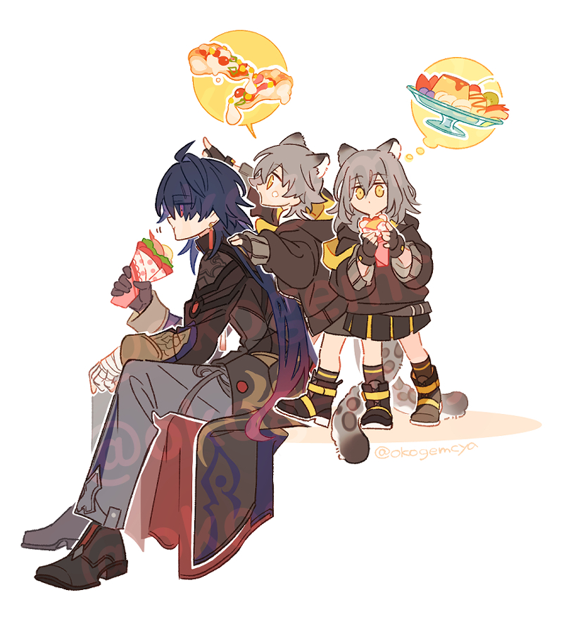 1girl 2boys animal_ears animal_print bandaged_hand bandages black_coat black_footwear black_hair blade_(honkai:_star_rail) caelus_(honkai:_star_rail) coat earrings eating food grey_pants holding holding_food honkai:_star_rail honkai_(series) jewelry leopard_boy leopard_ears leopard_girl leopard_print leopard_tail long_hair long_sleeves looking_to_the_side multiple_boys okogemcya pants red_eyes simple_background sitting snow_leopard snow_leopard_ears snow_leopard_tail stelle_(honkai:_star_rail) tail trailblazer_(honkai:_star_rail) yellow_eyes