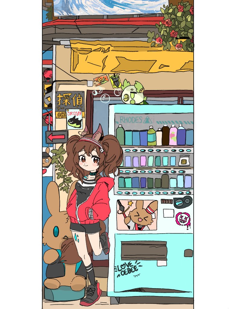 >_< 1girl angelina_(arknights) animal_ear_fluff animal_ears animalization arknights black_shirt black_shoes black_shorts black_socks breasts brown_eyes brown_hair building closed_mouth commentary_request day dr._mijinko dragon_bean_(arknights) flower hairband hands_in_pockets hood hood_down hooded_jacket jacket long_sleeves medium_breasts muelsyse_(arknights) open_clothes open_jacket outdoors puffy_long_sleeves puffy_sleeves red_flower red_hairband red_jacket red_rose rose shirt shoes short_shorts shorts smile socks solo standing standing_on_one_leg star_(symbol) striped_clothes striped_hairband tail twintails vending_machine